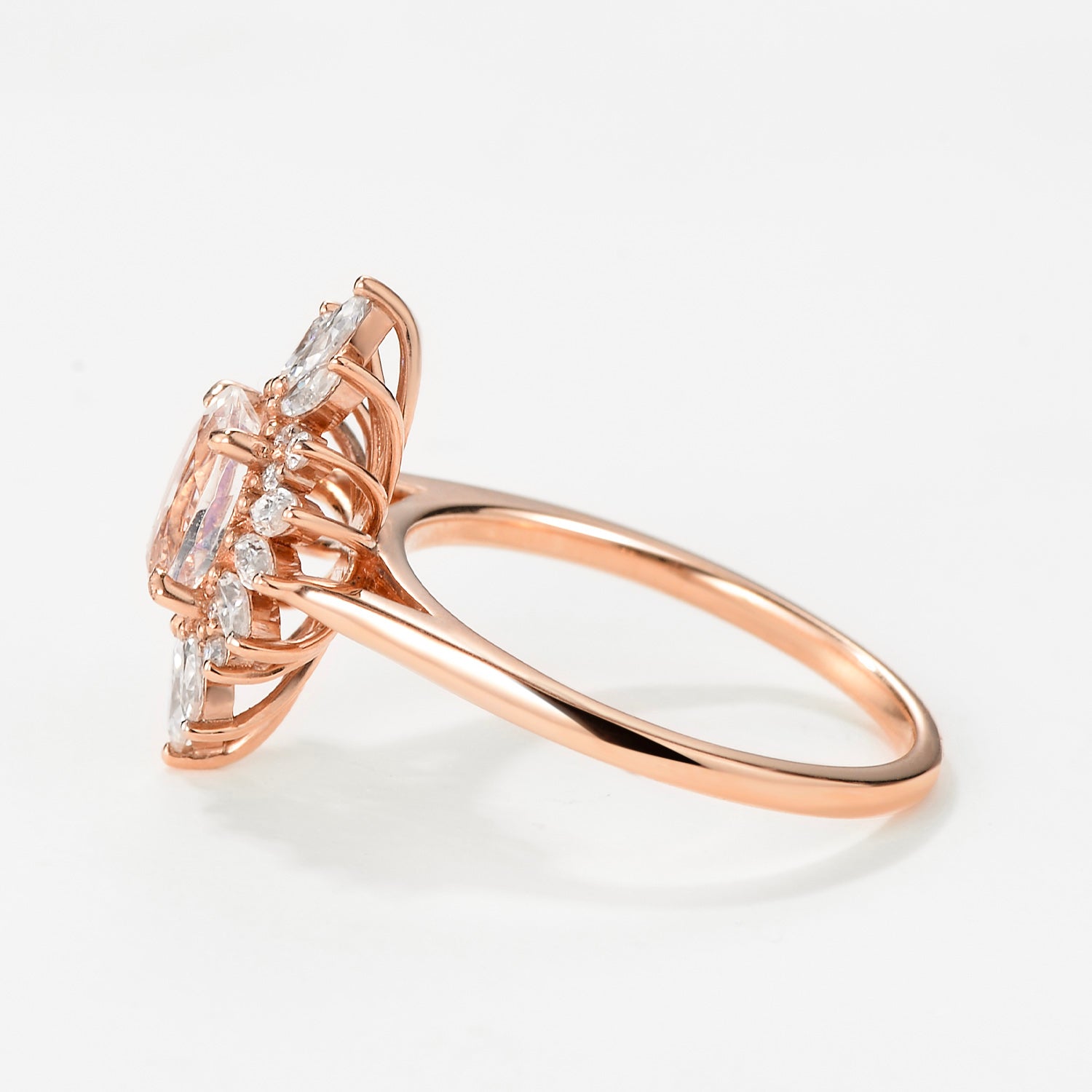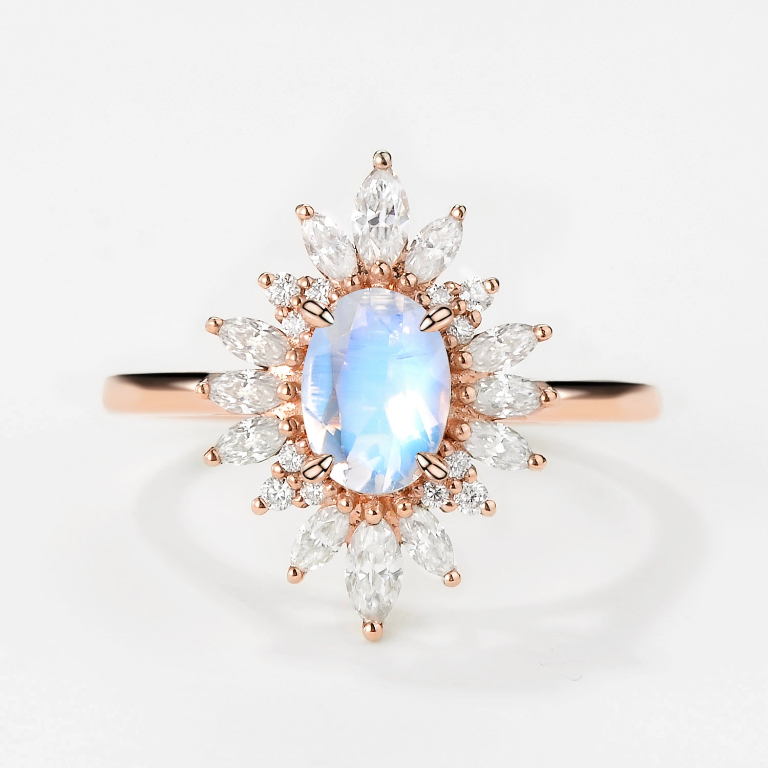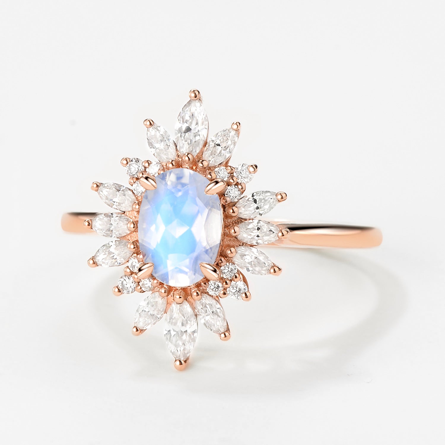 Felicegals 5*7mm Oval Cut Moonstone & Moissanite Rose Gold Halo Ring Flower Cluster Moissanite Ring Anniversary Gift Promise Antique Wedding Ring