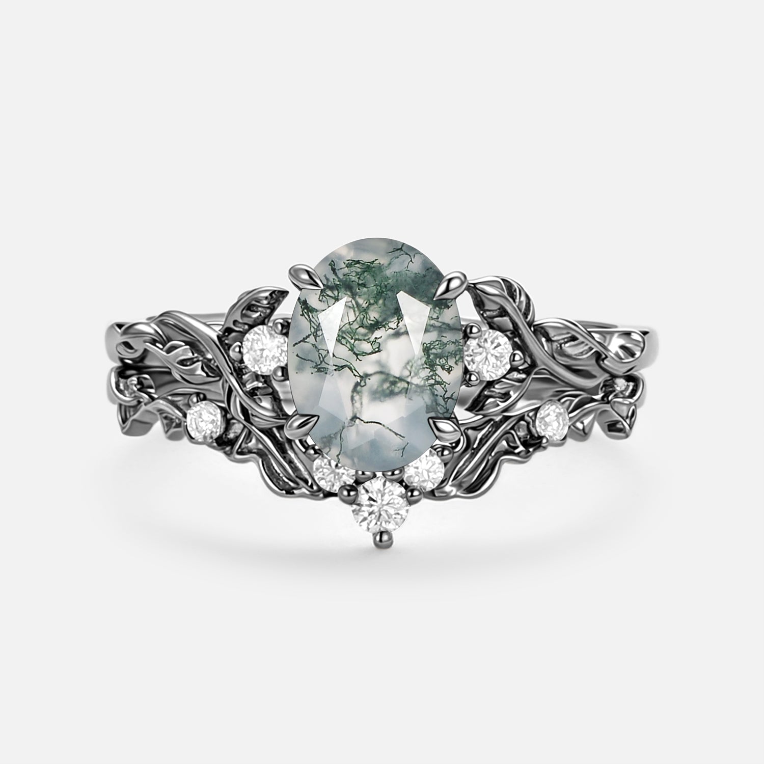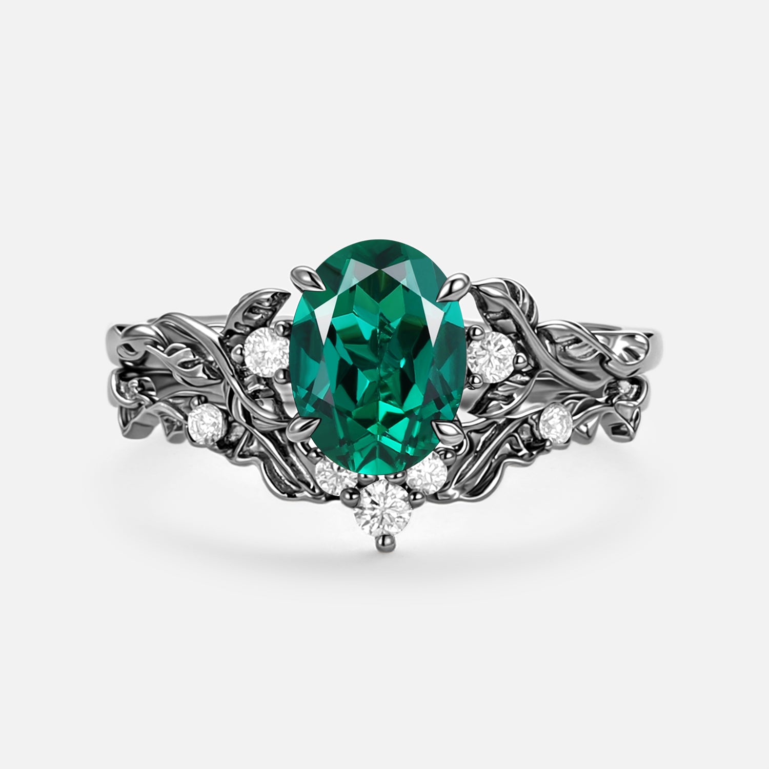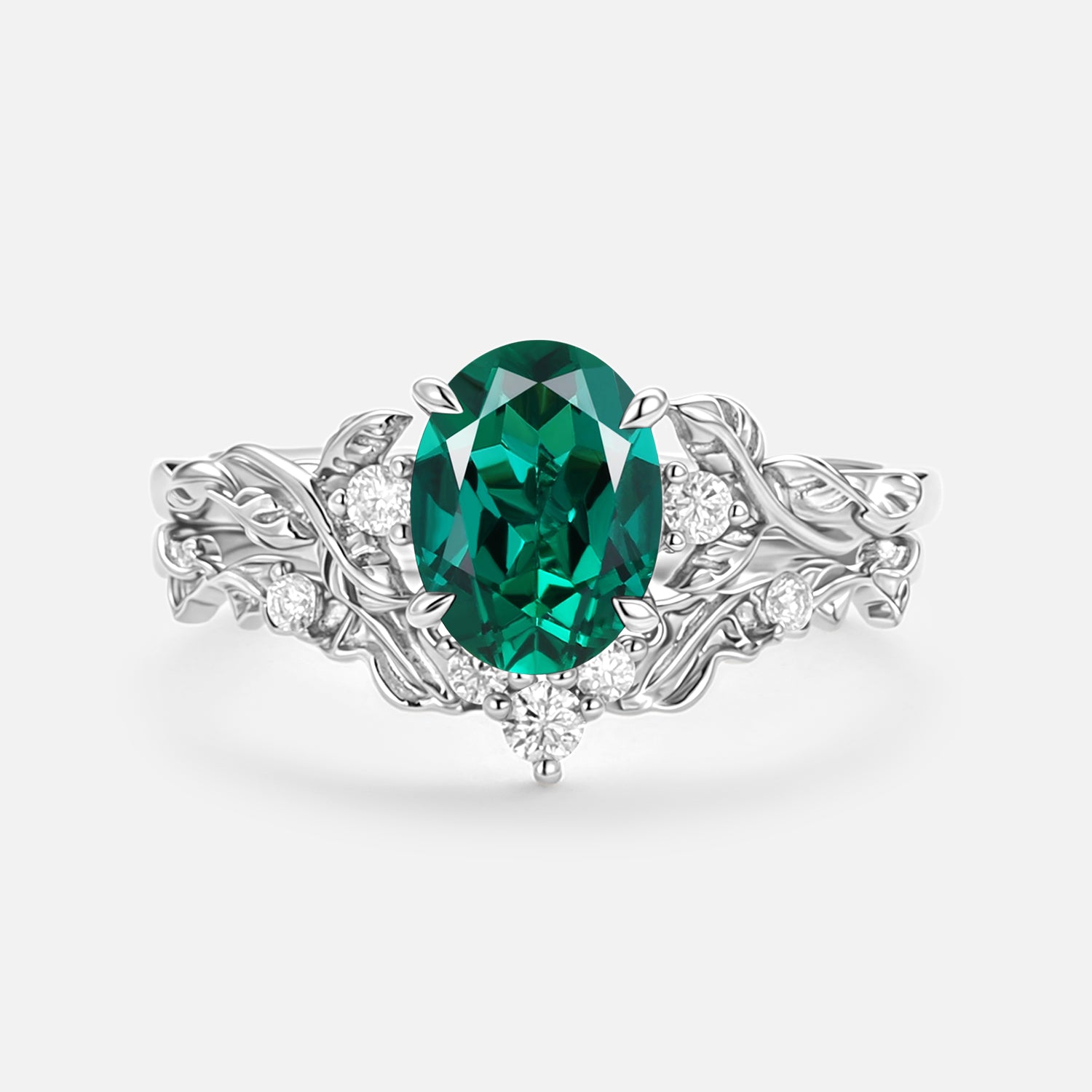 Oval Shaped Lab Emerald Leafy Engagement Ring Set 2pcs - Brook