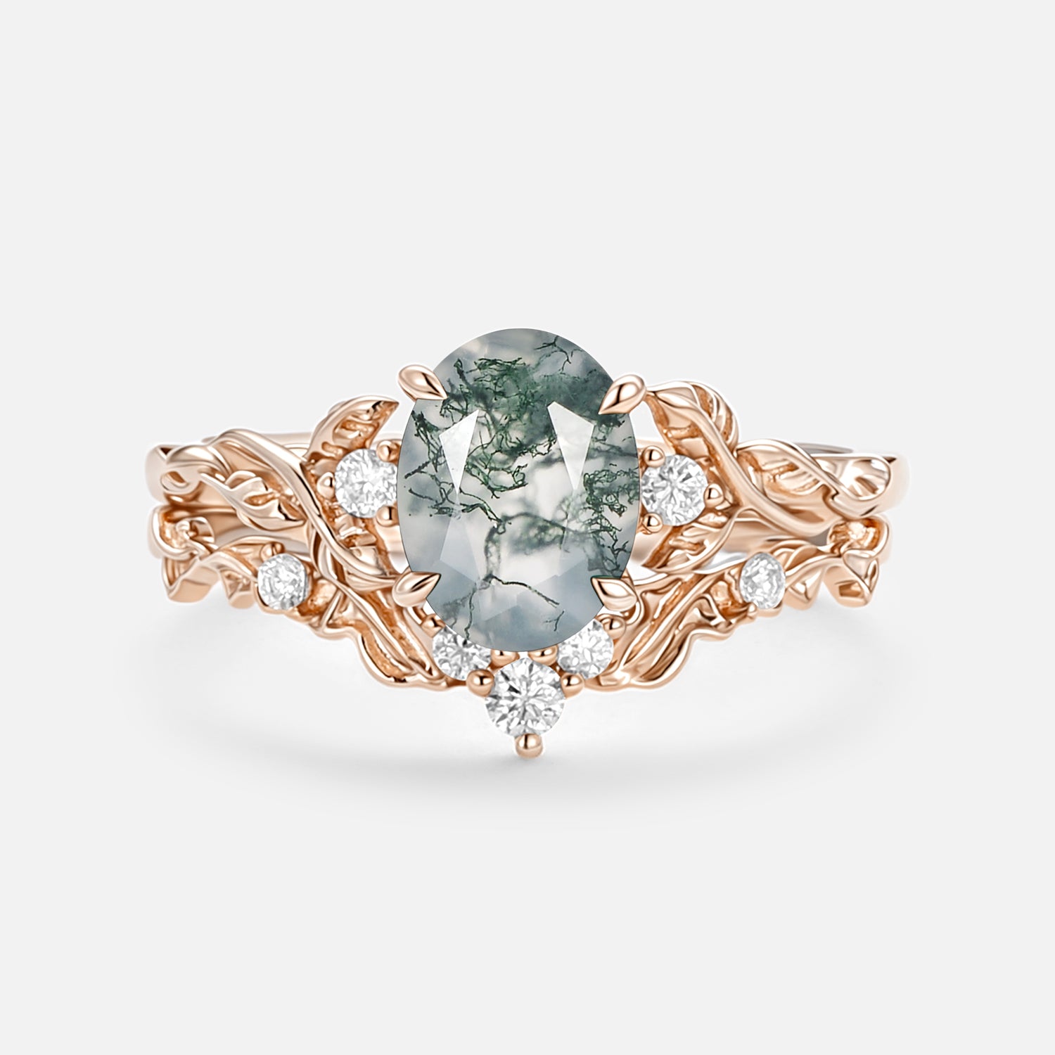 At its core, a lush emerald rests, deep and radiant, holding the weight of your commitment like a secret kept close. And wrapping around the band, delicate leaves curve softly, as if they’ve grown right there to cradle your love.