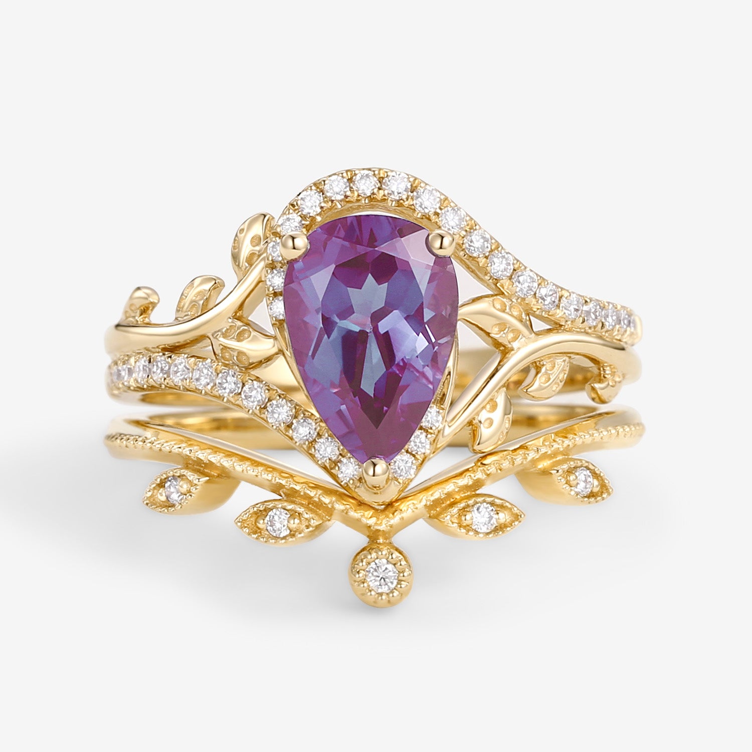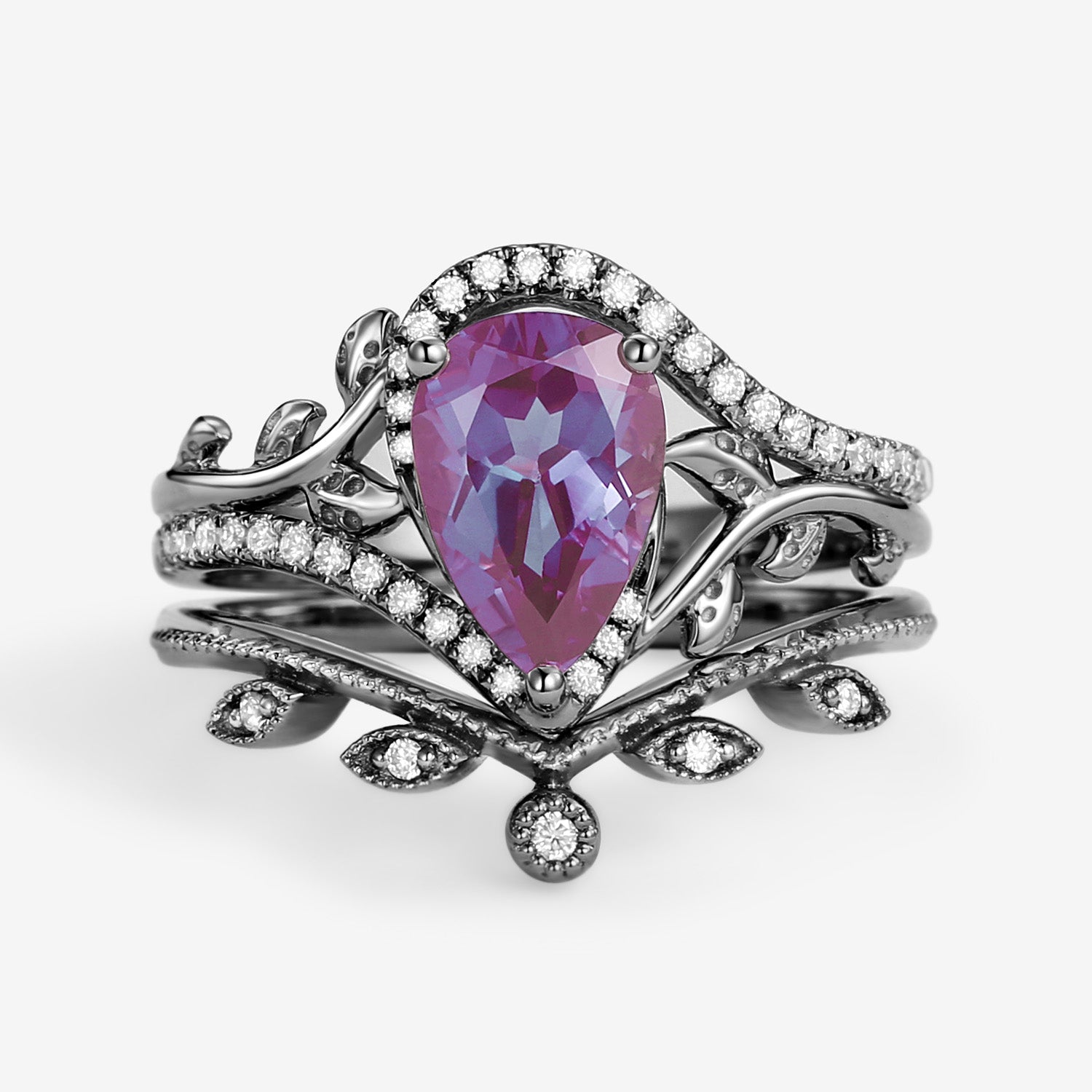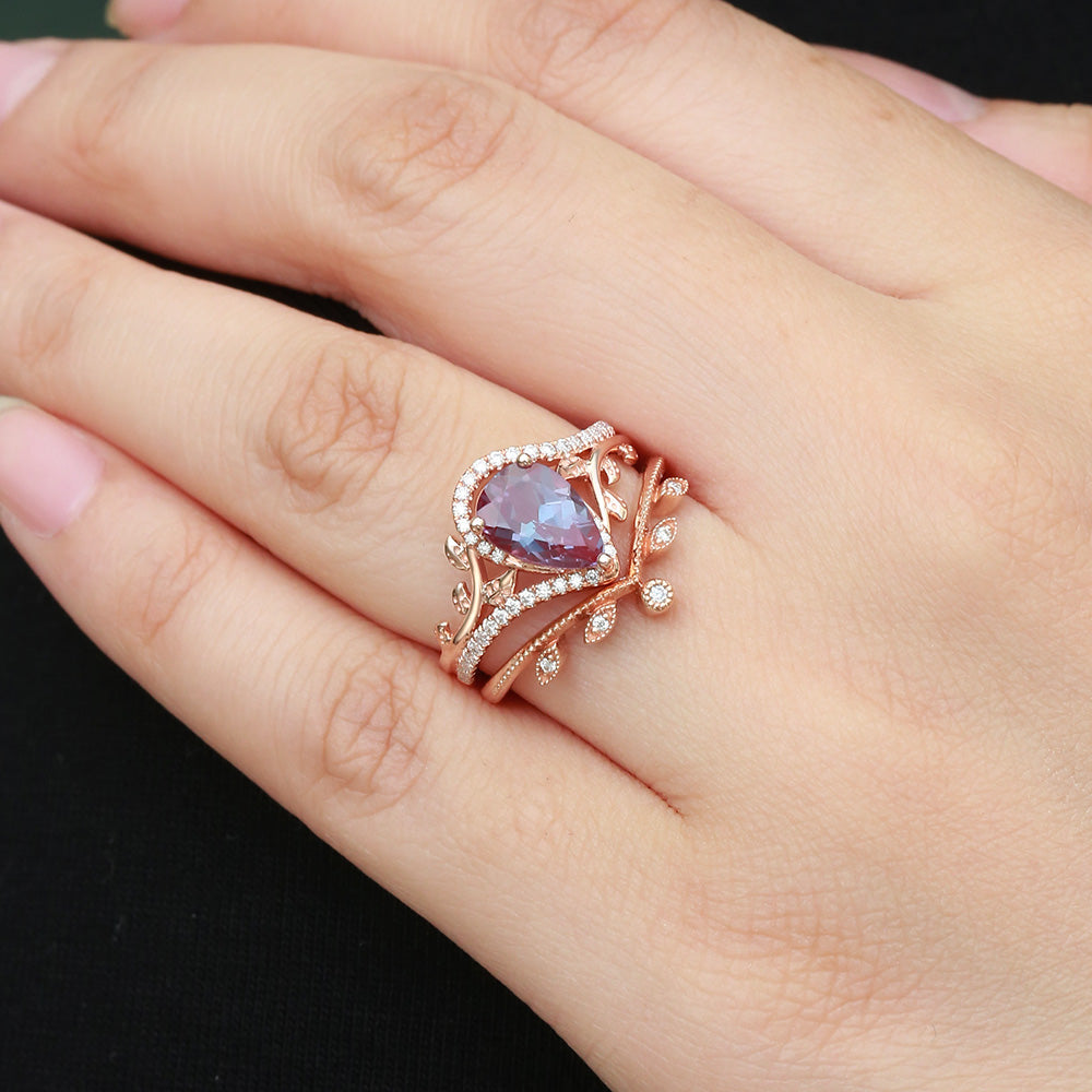 Felicegals Vintage Pear Cut Alexandrite & Moissanite Leafy Ring Set 2pcs Moissanite Custom Curved Matching Ring