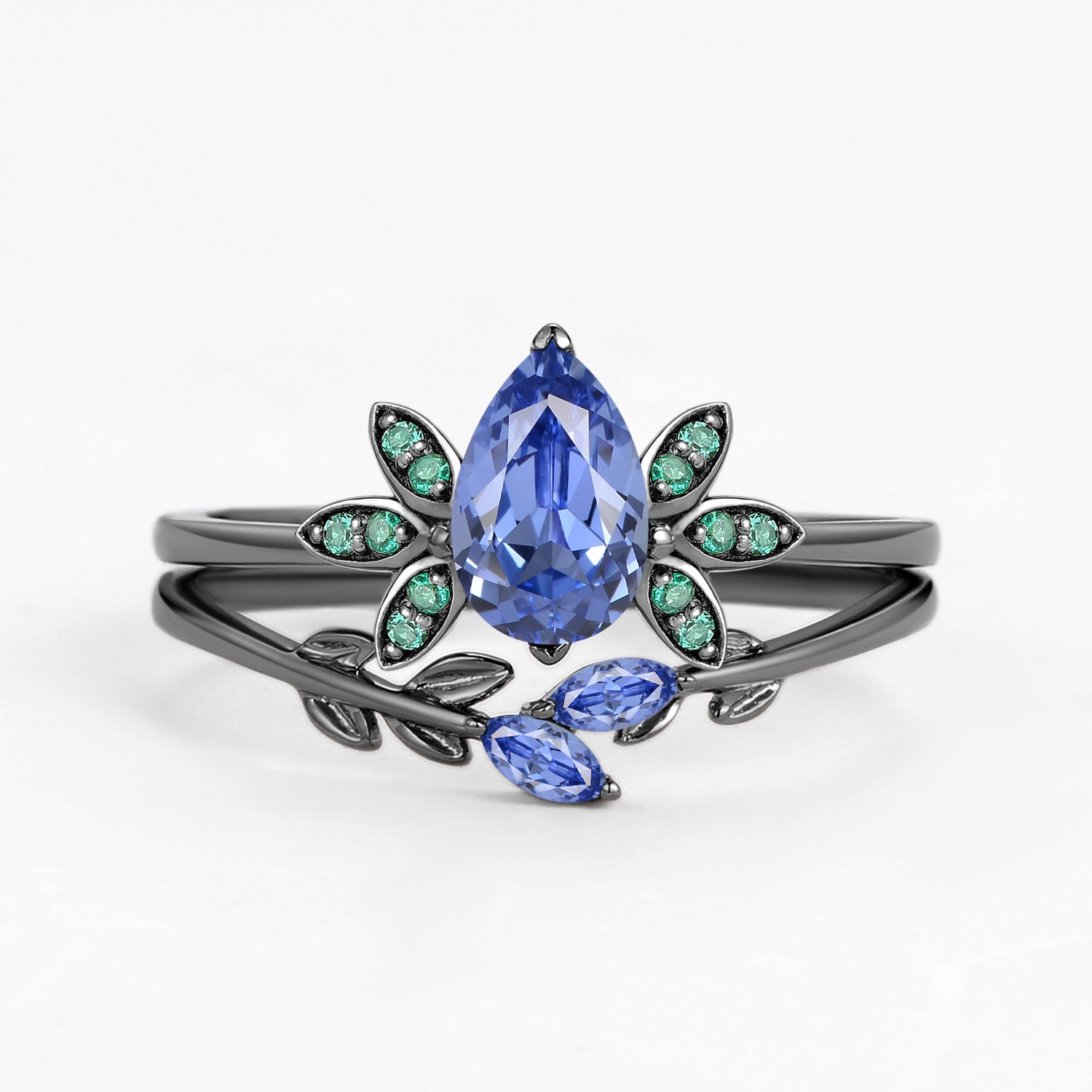 Pear Cut Lab Cornflower Blue Sapphire Leafy Ring Set 2pcs