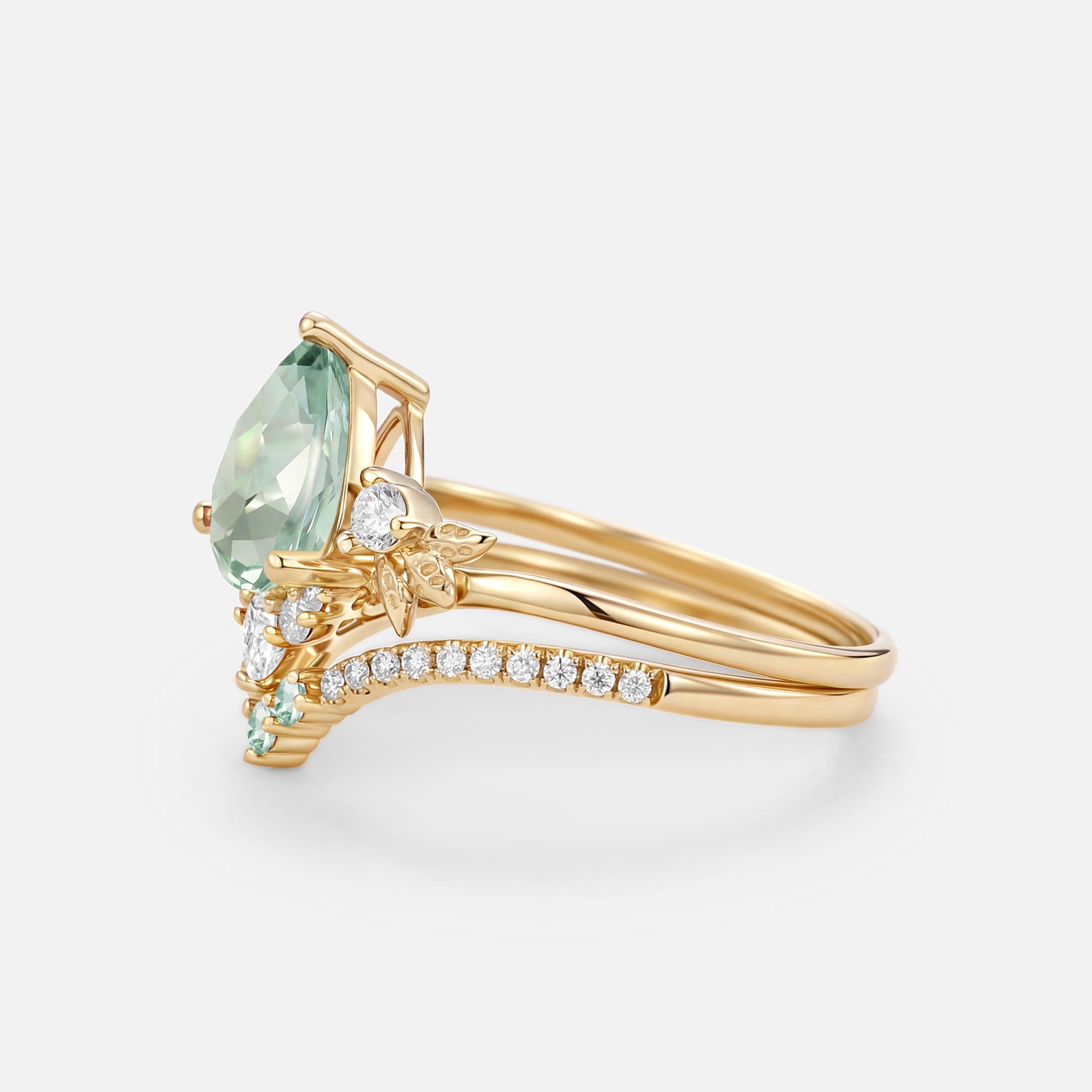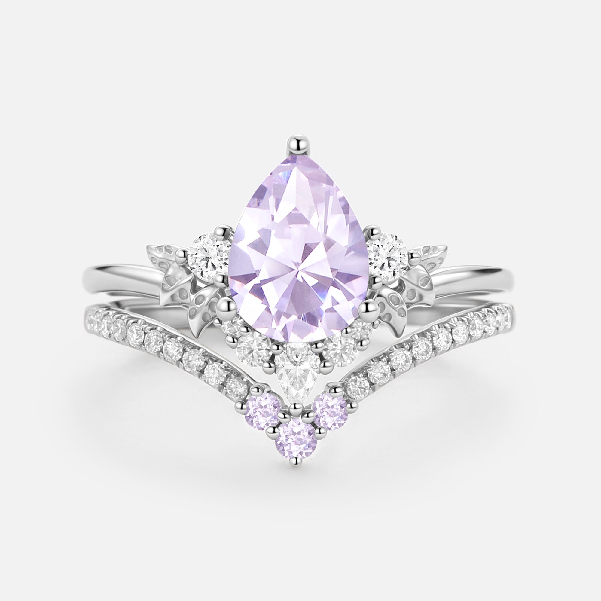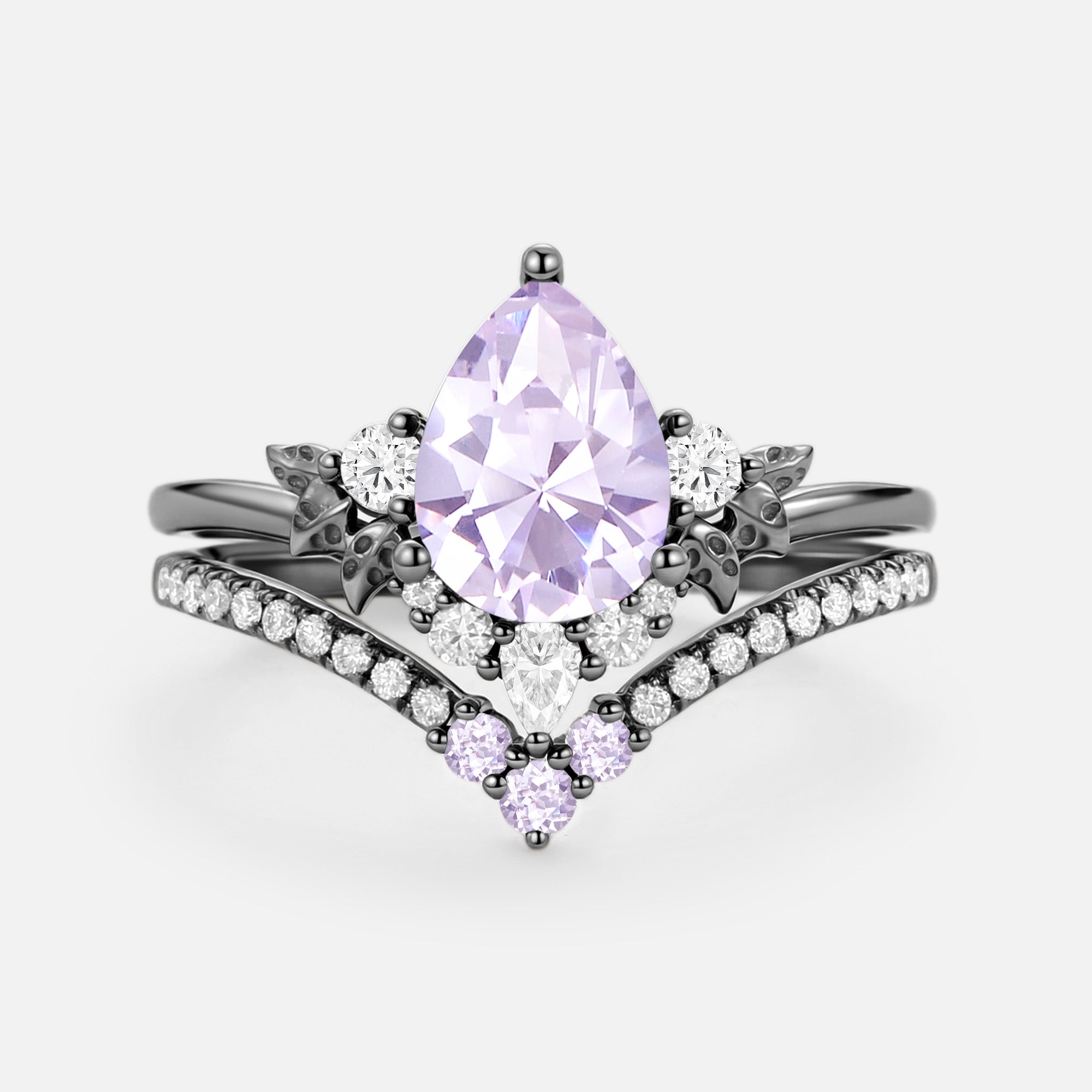 Embrace the delicate grace of the Mauve engagement ring set. The luminous lab green sapphire at its core, shaped into a sleek pear cut with brilliant, light-kissing facets, casts a soft, dreamy purple glow with every subtle movement. It’s delicately secured by refined prongs, while both bands of the 2pcs set are adorned with exquisitely carved leafy patterns—echoing the gentle curl of lavender blooms swaying in a sun-dappled garden. This intricate detailing lets the set exude soft, romantic charm from every angle.