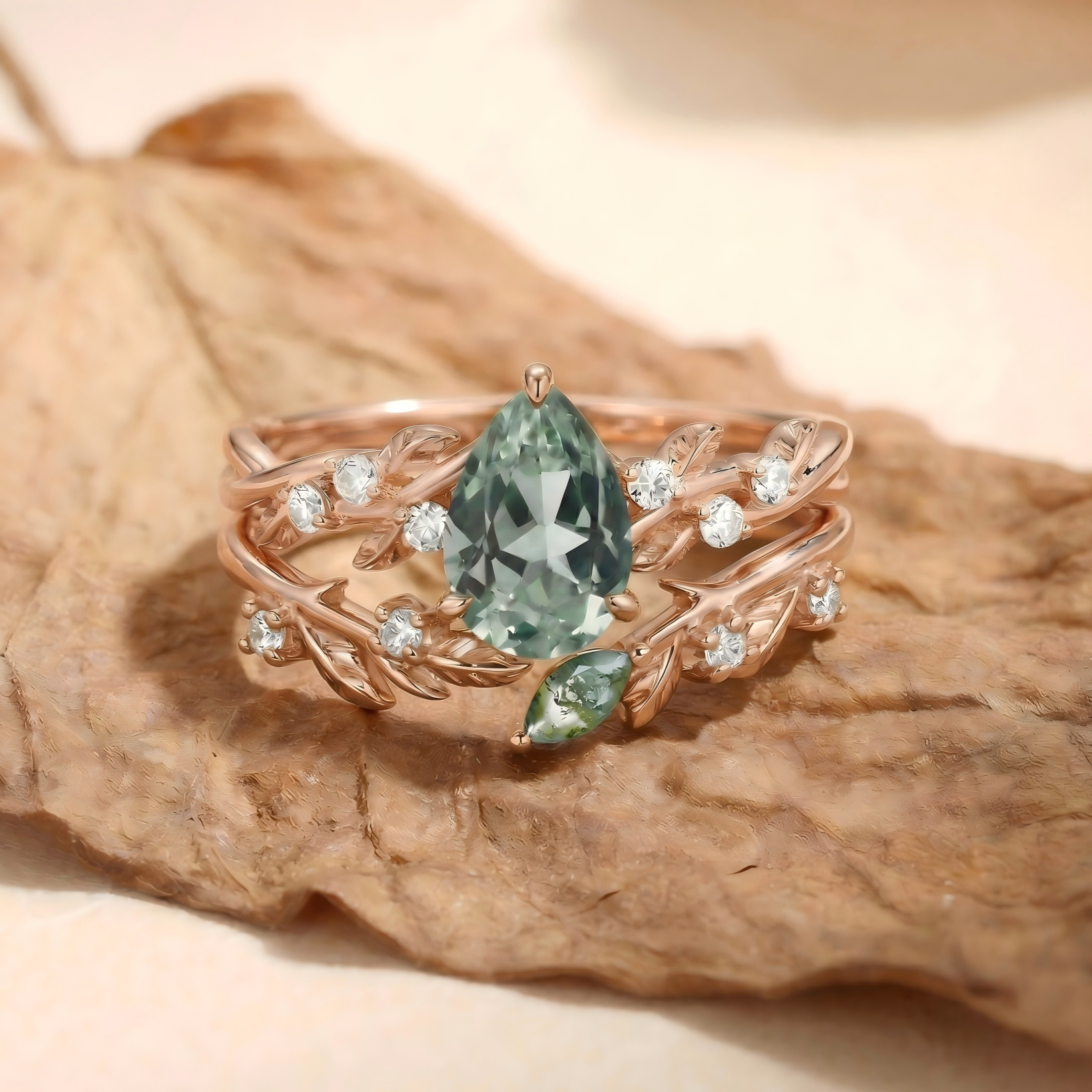 Pear Cut Leafy Lab Green Sapphire Engagement Ring Set 2pcs - Leto