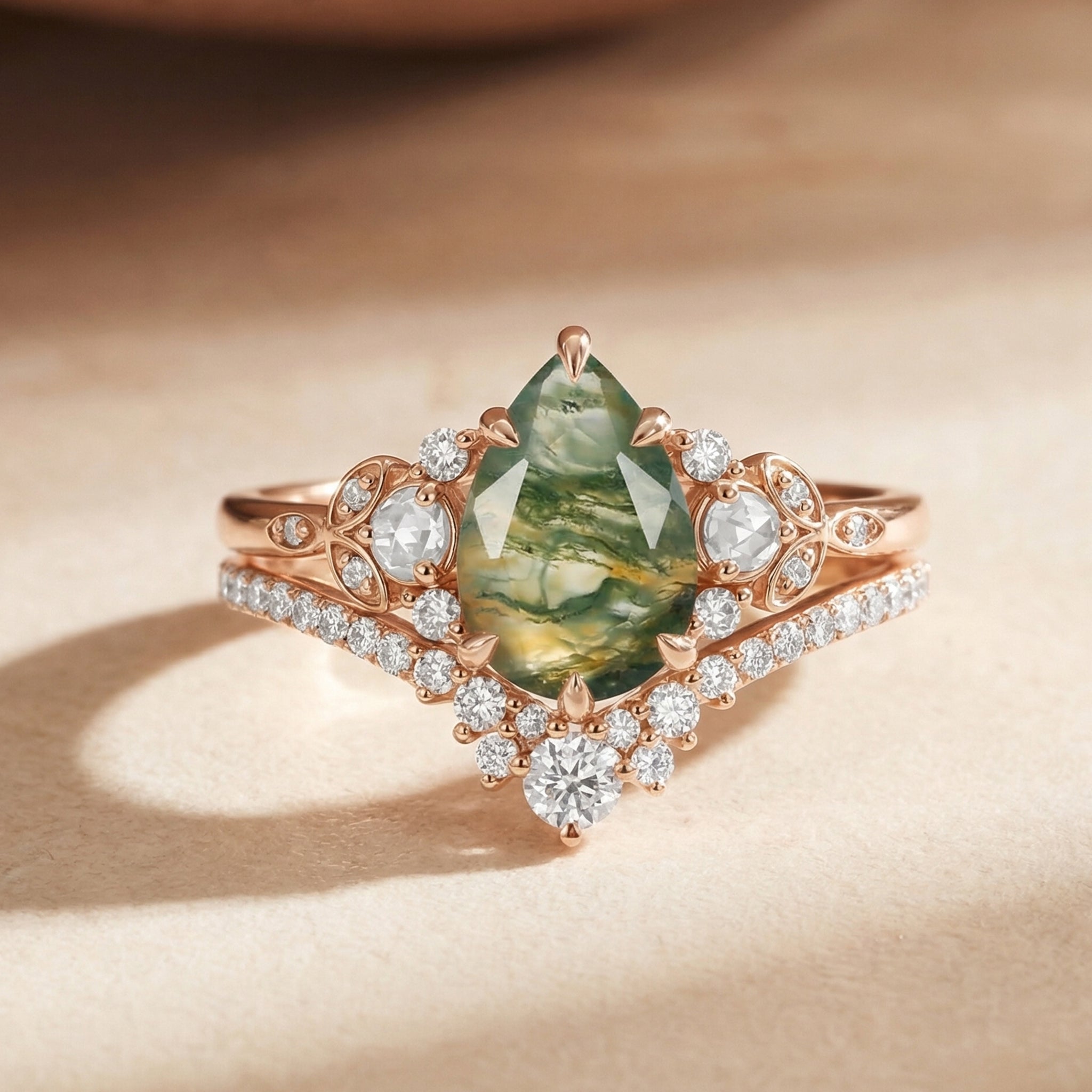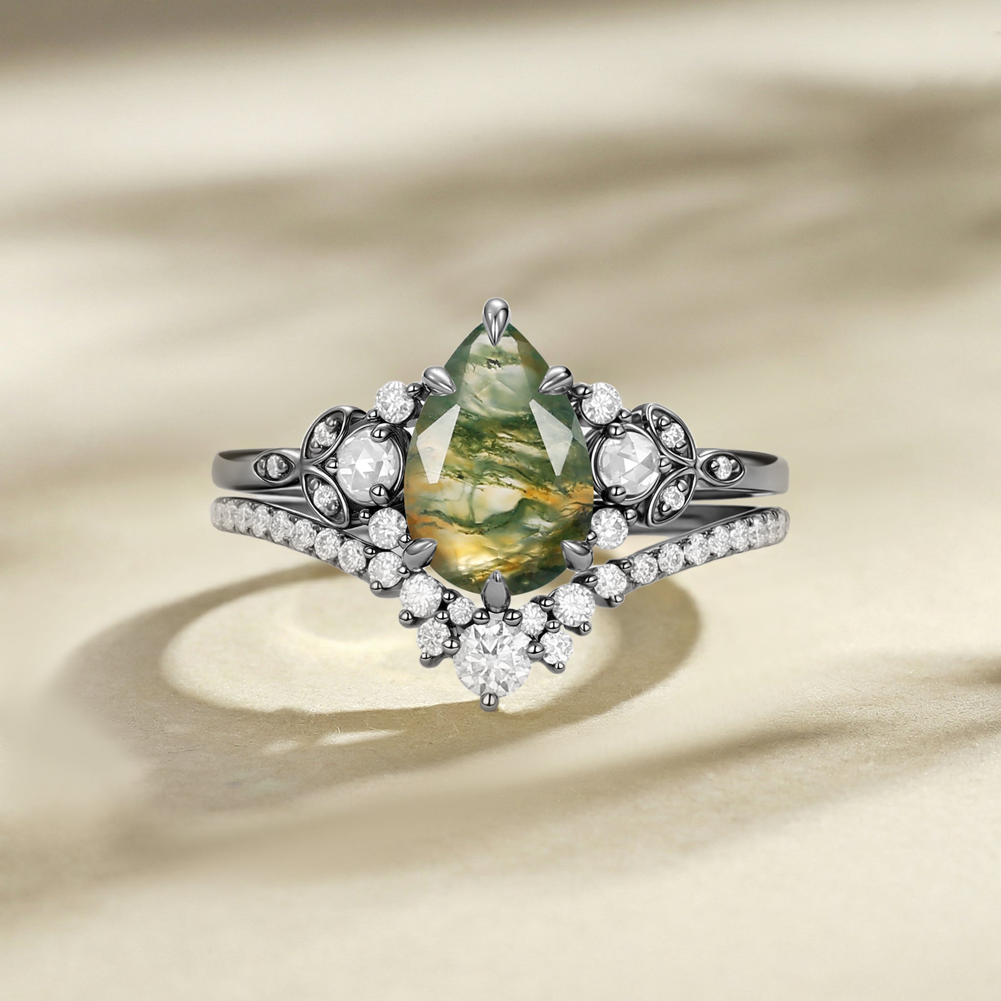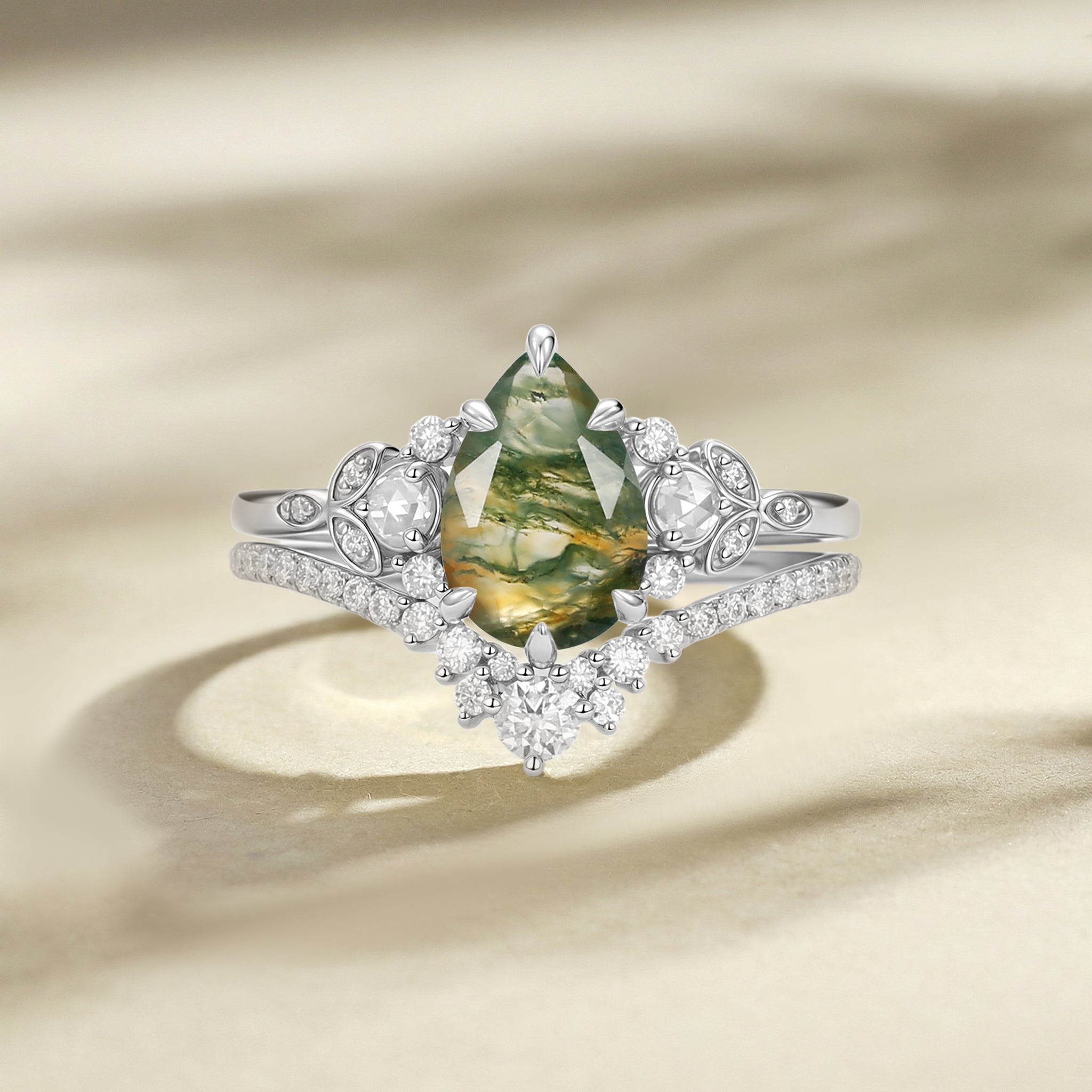 Pear Cut Moss Agate Classic Cluster Ring Set 2pcs - Rhea