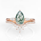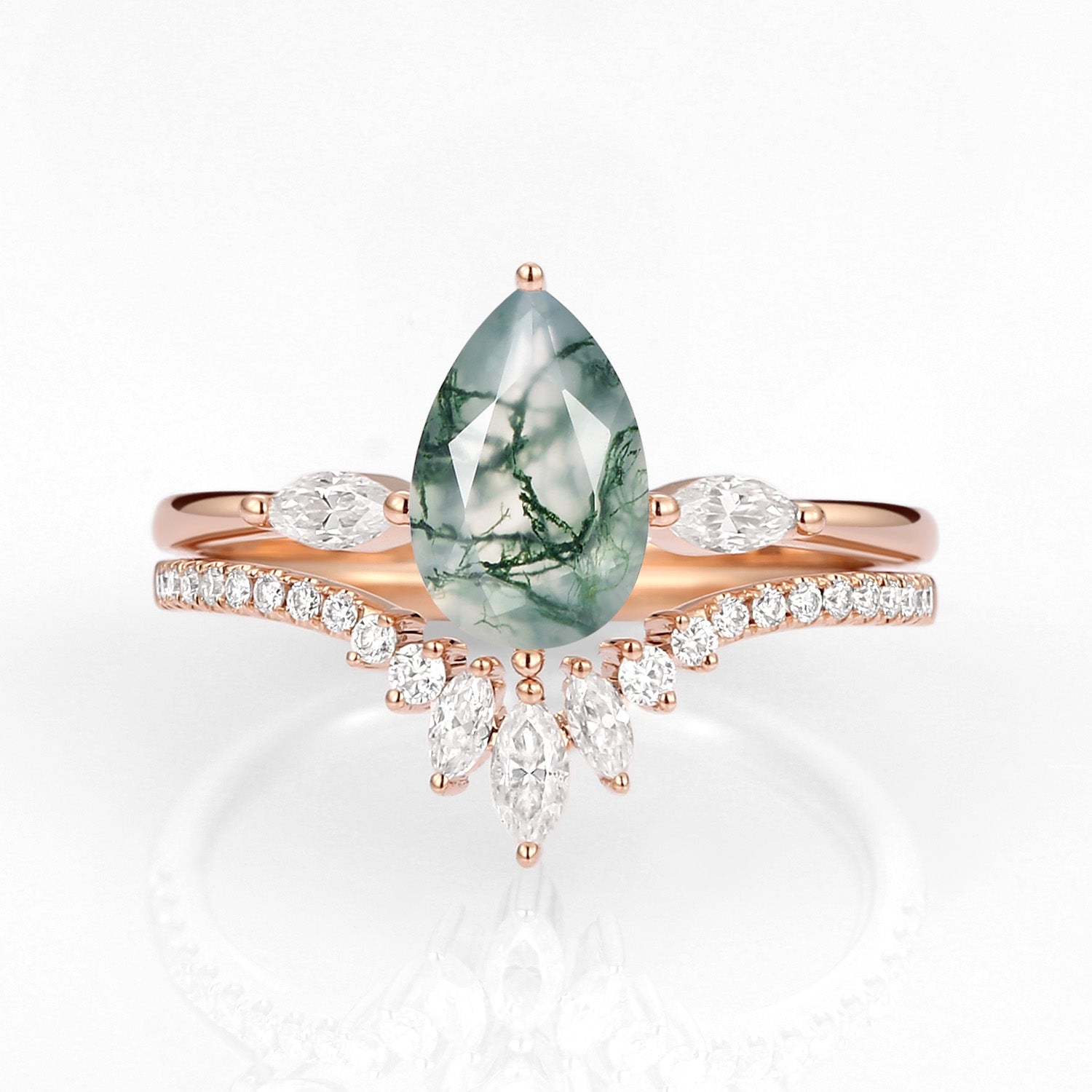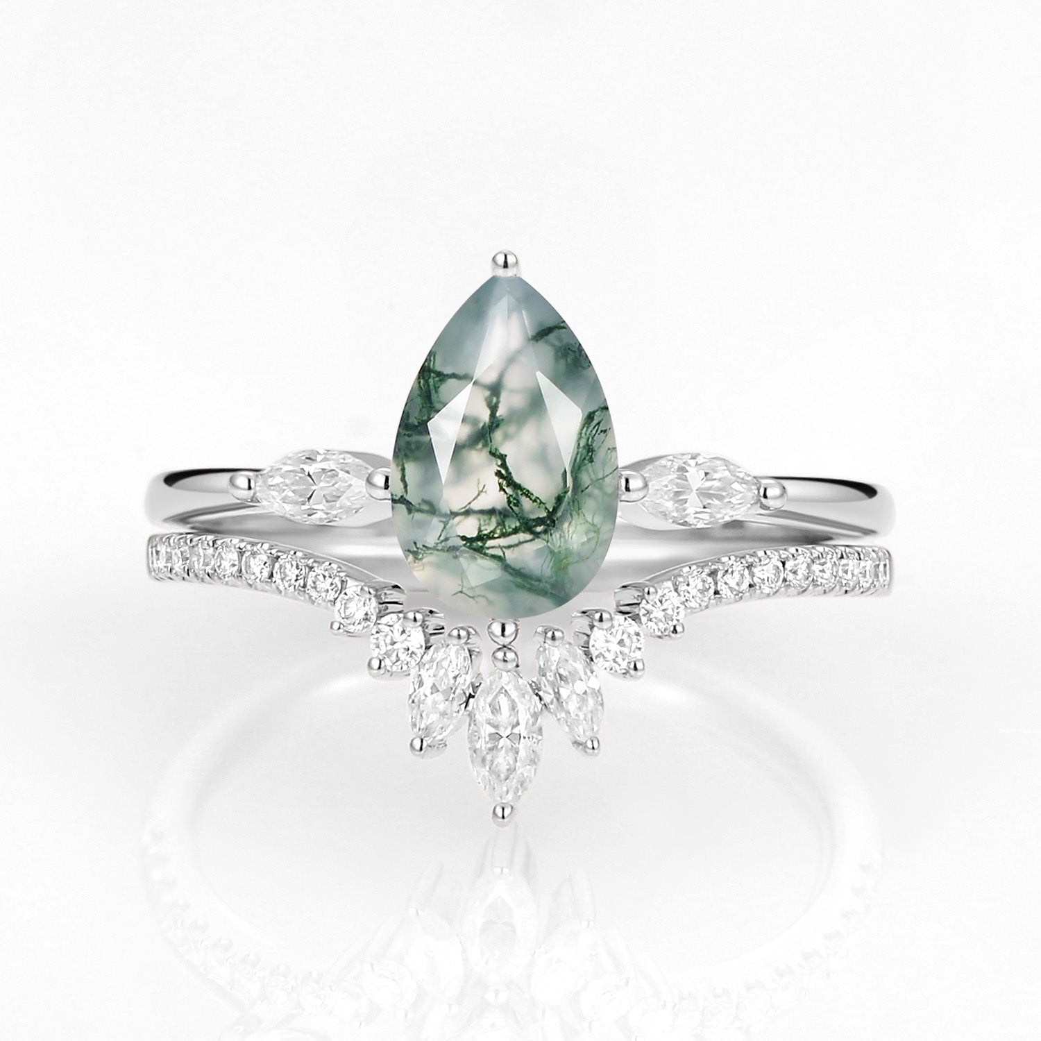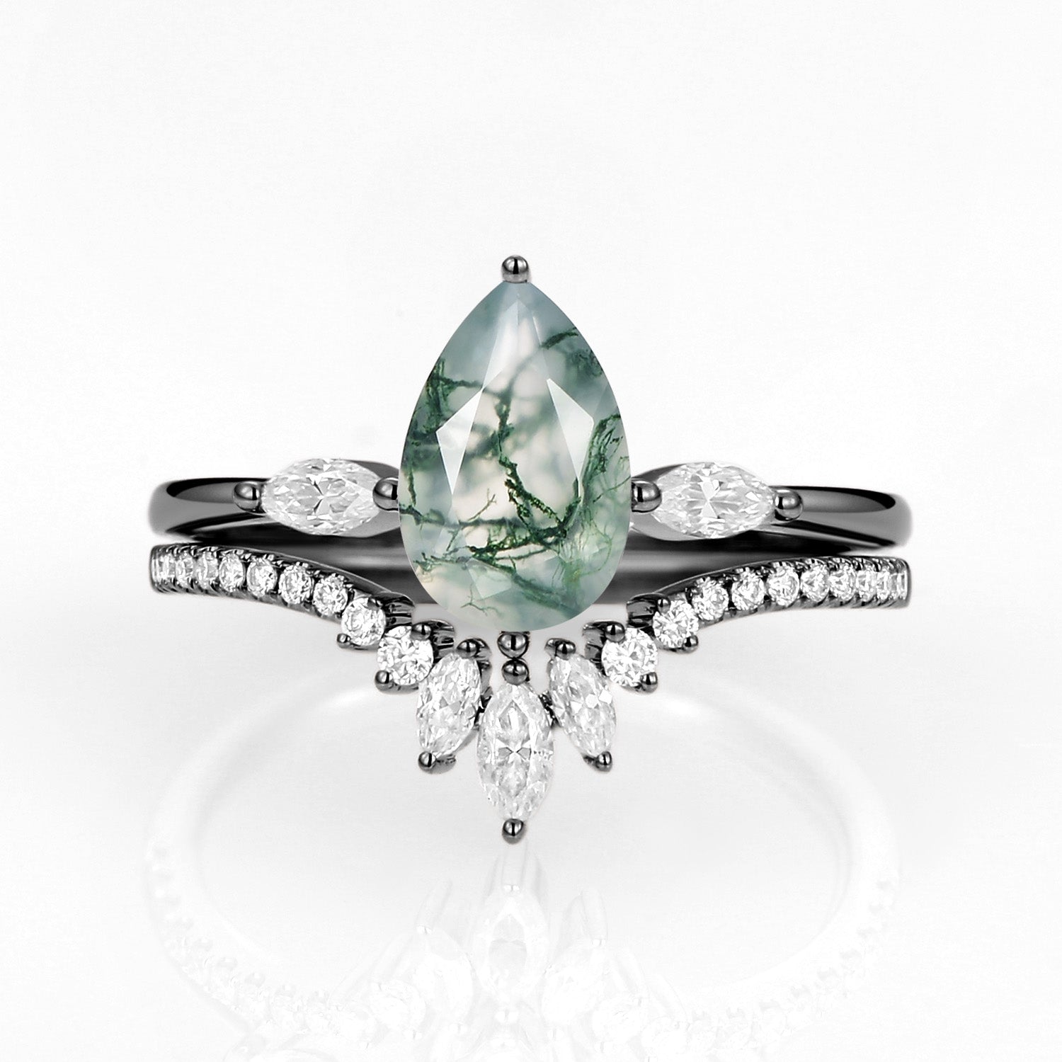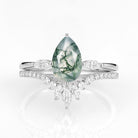 Pear Cut Moss Agate Engagement Ring Set 2pcs - Jream