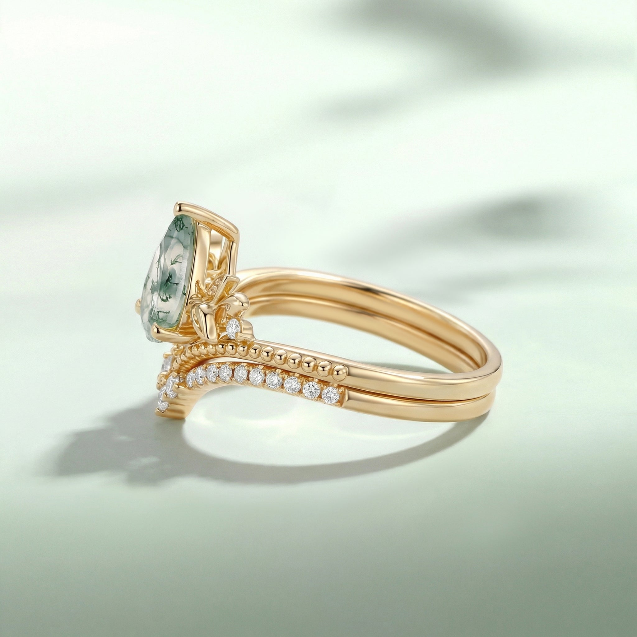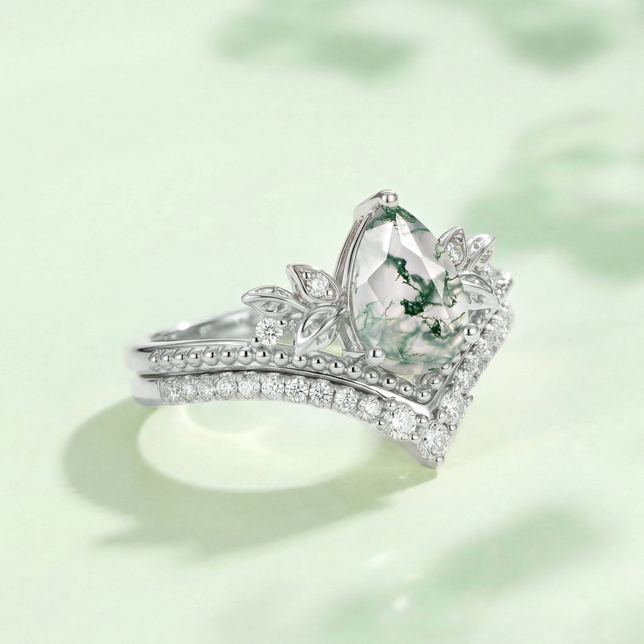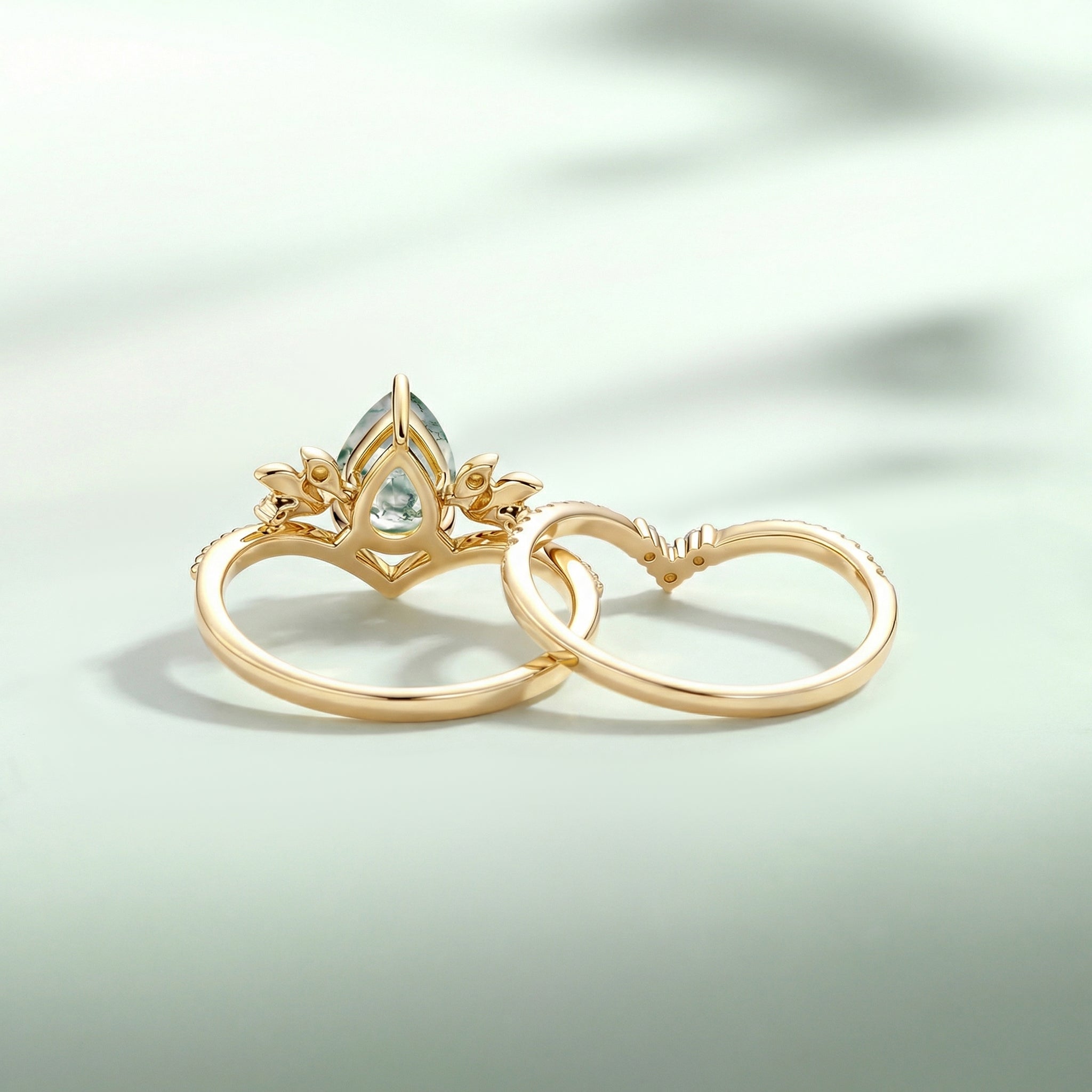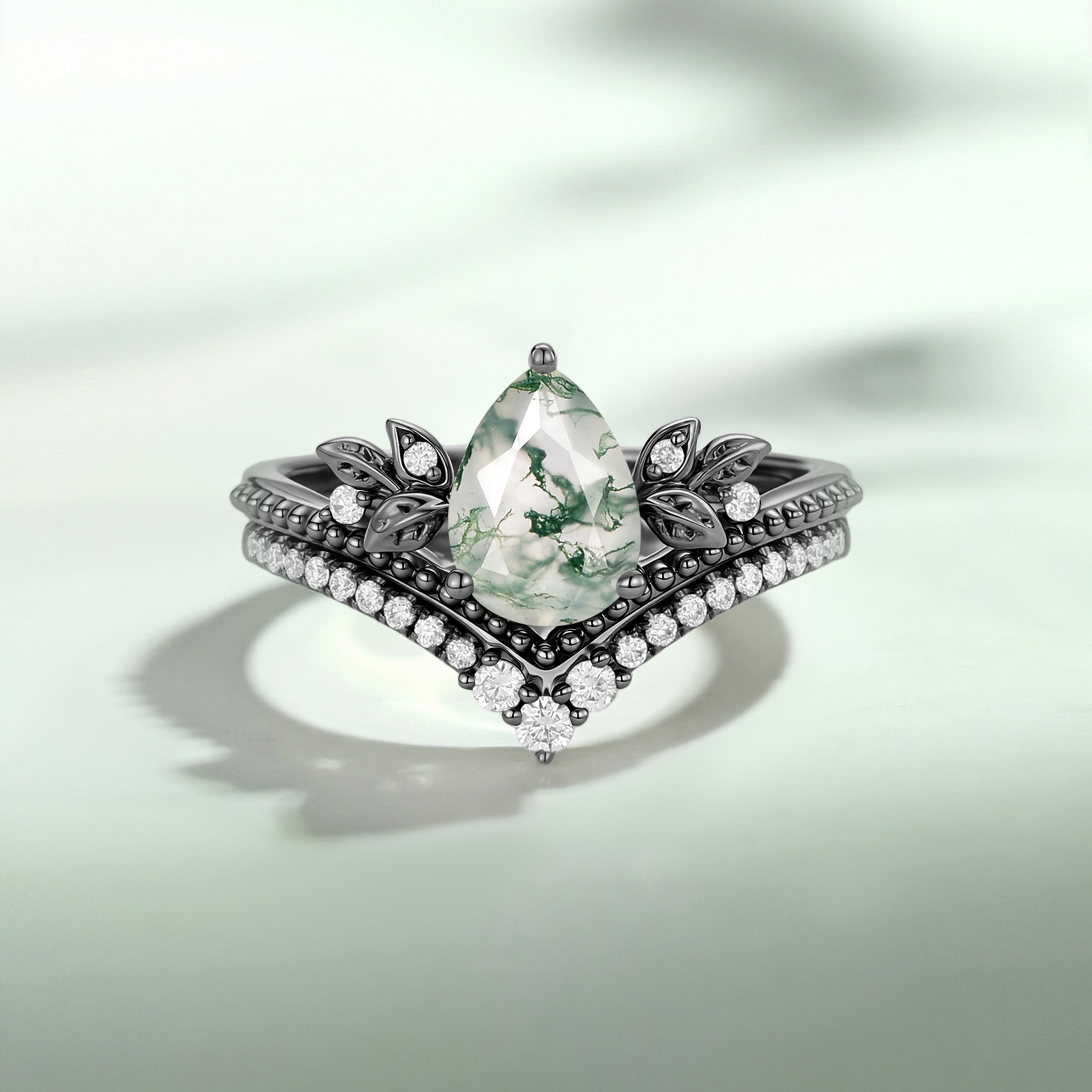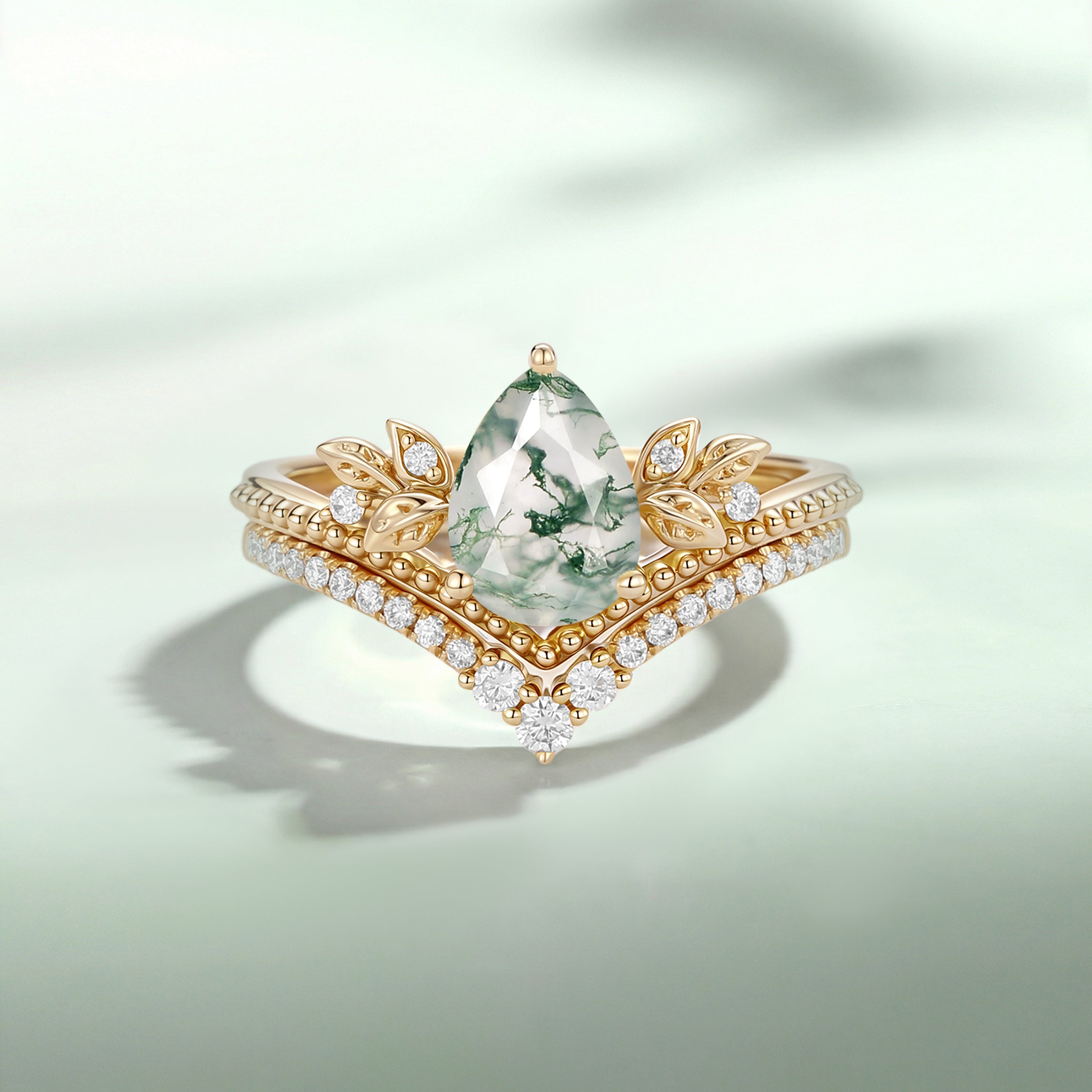 Pear Cut Moss Agate Leaf Ring Set 2pcs - Aureolin