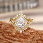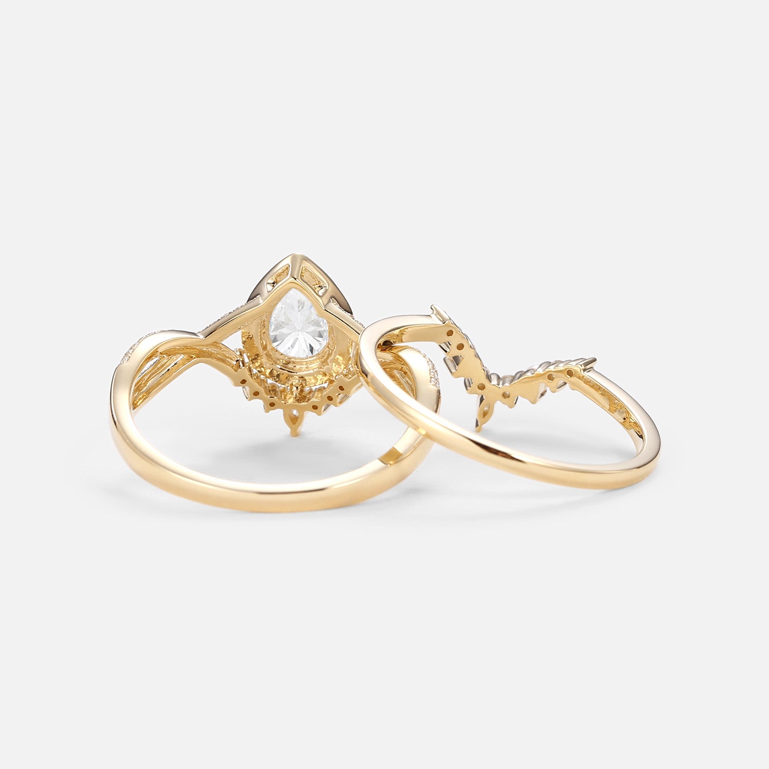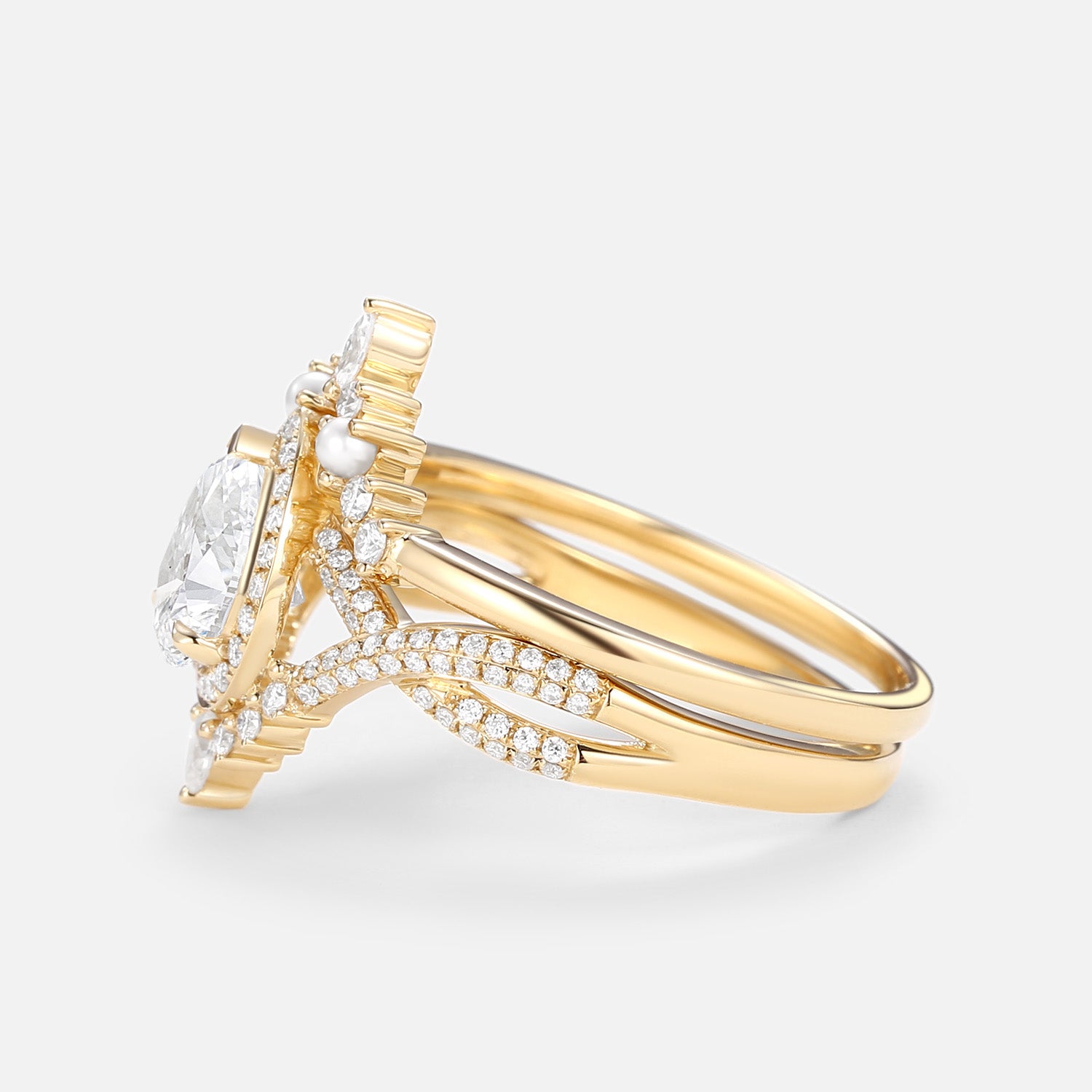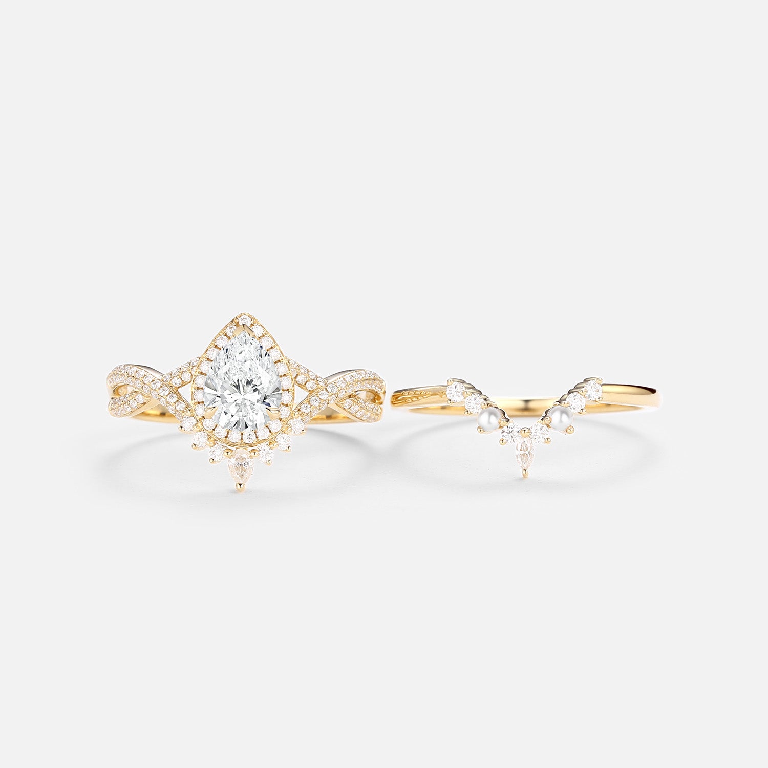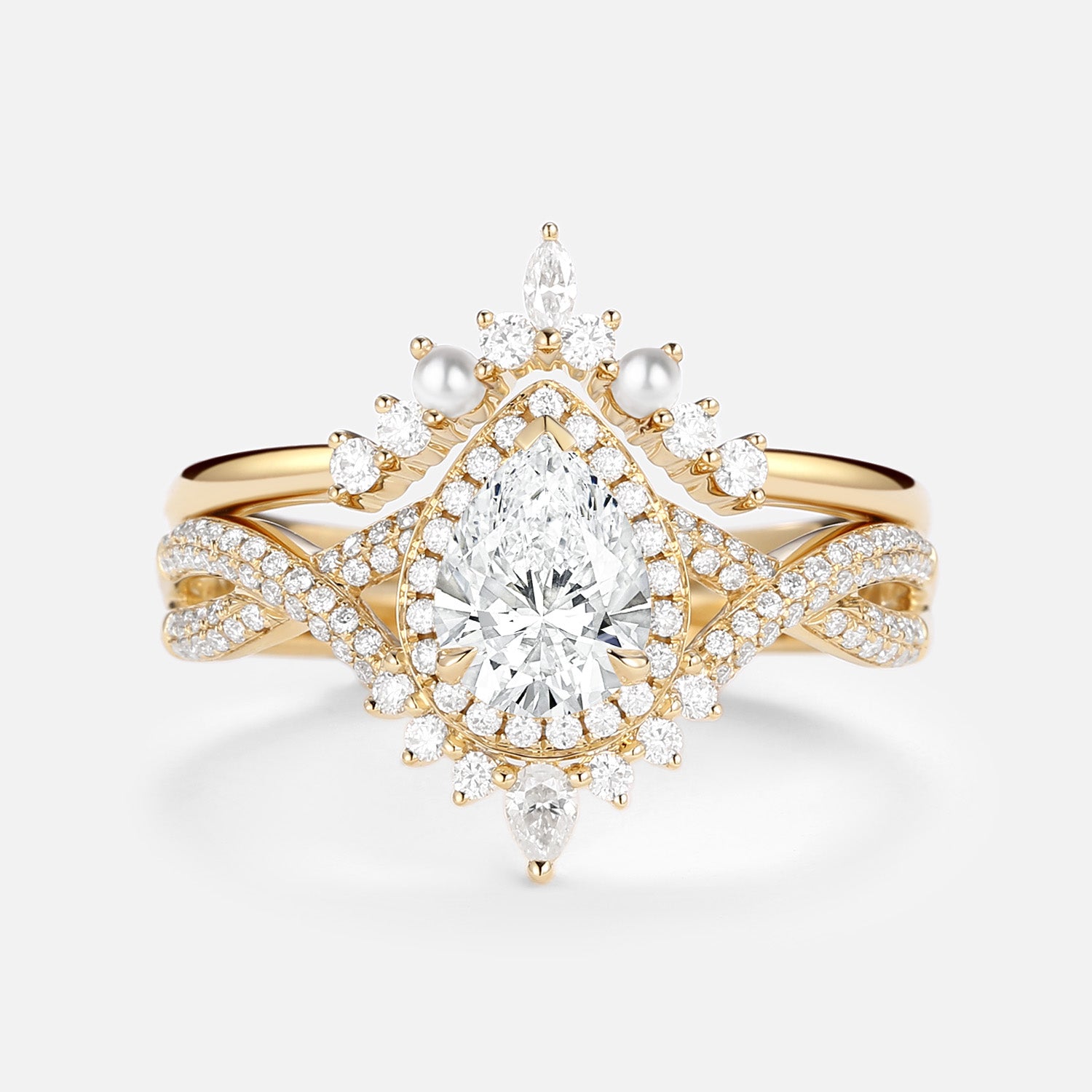 Pear Shaped Lab Grown Diamond & Pearl Halo Infinity Gold Ring Set 2pcs