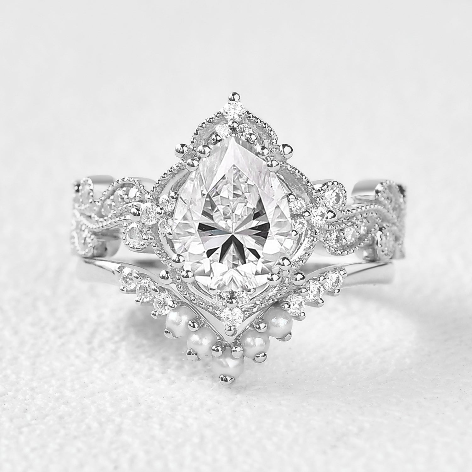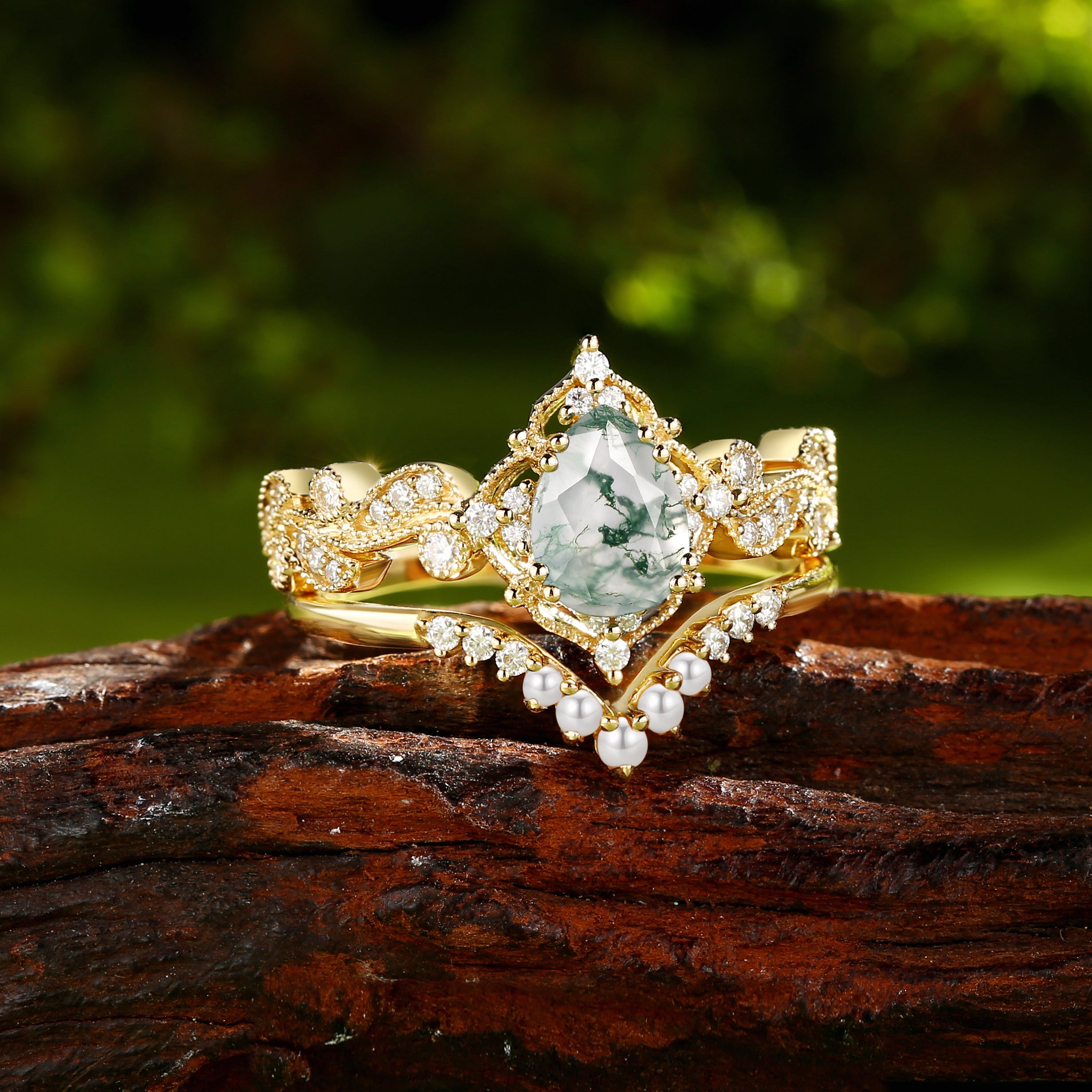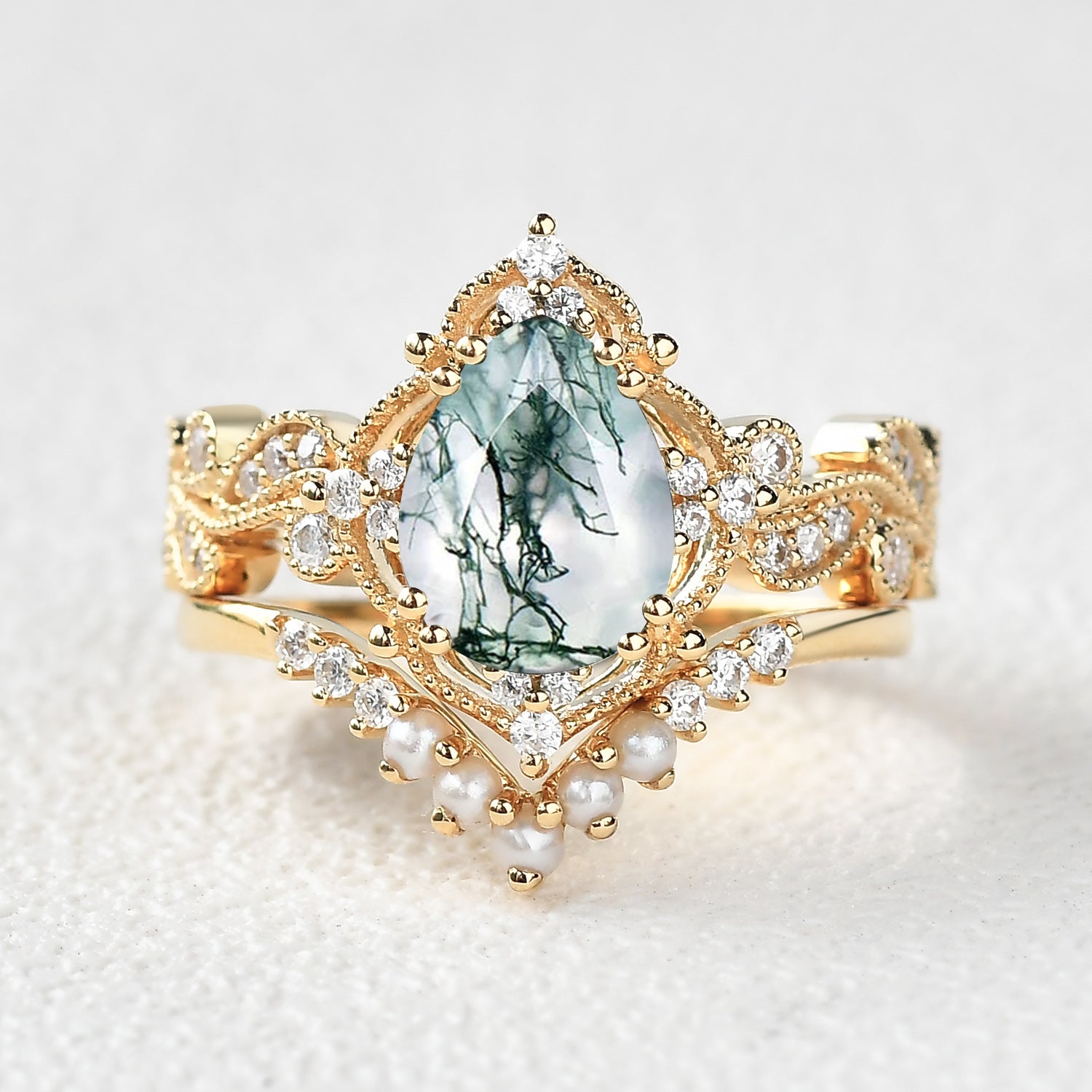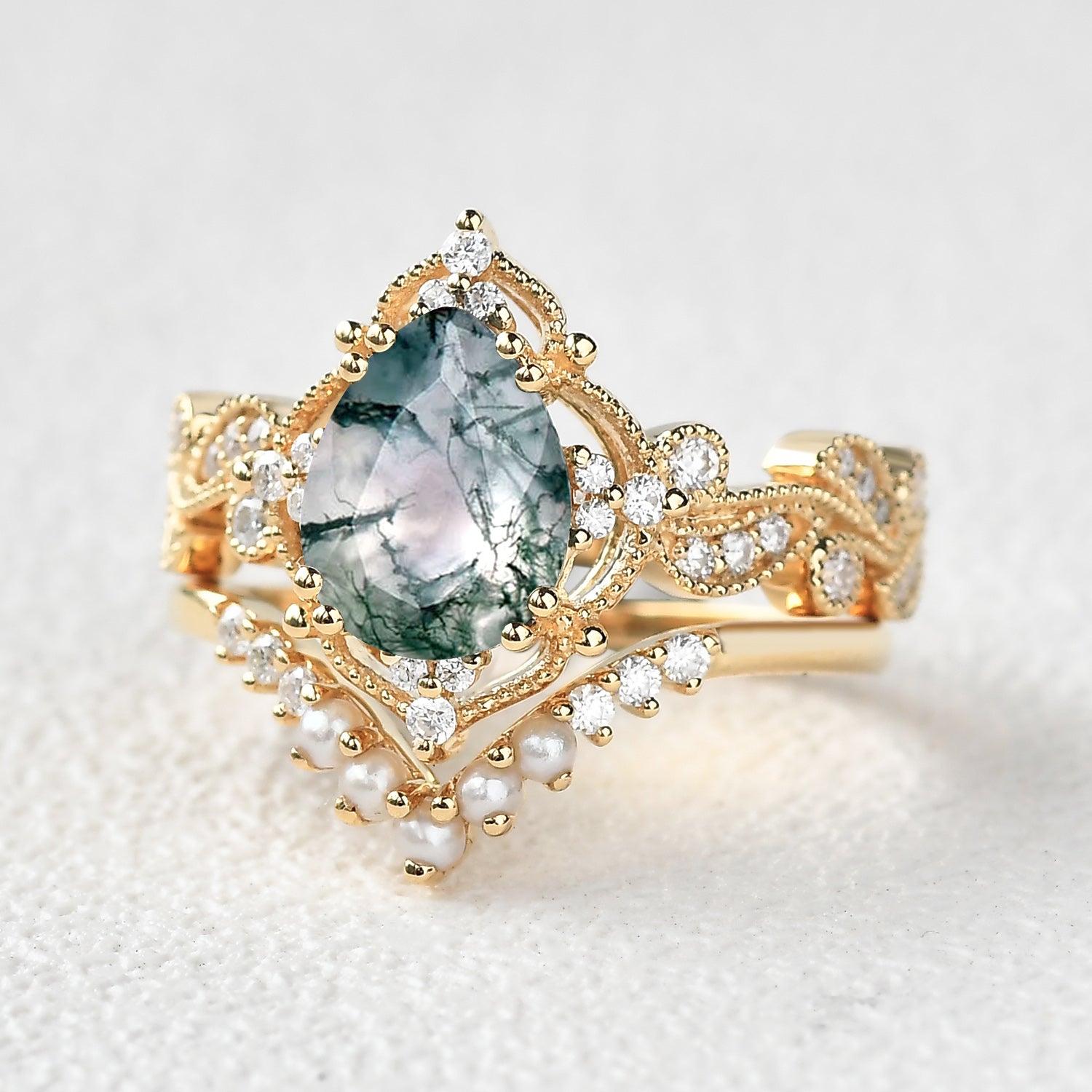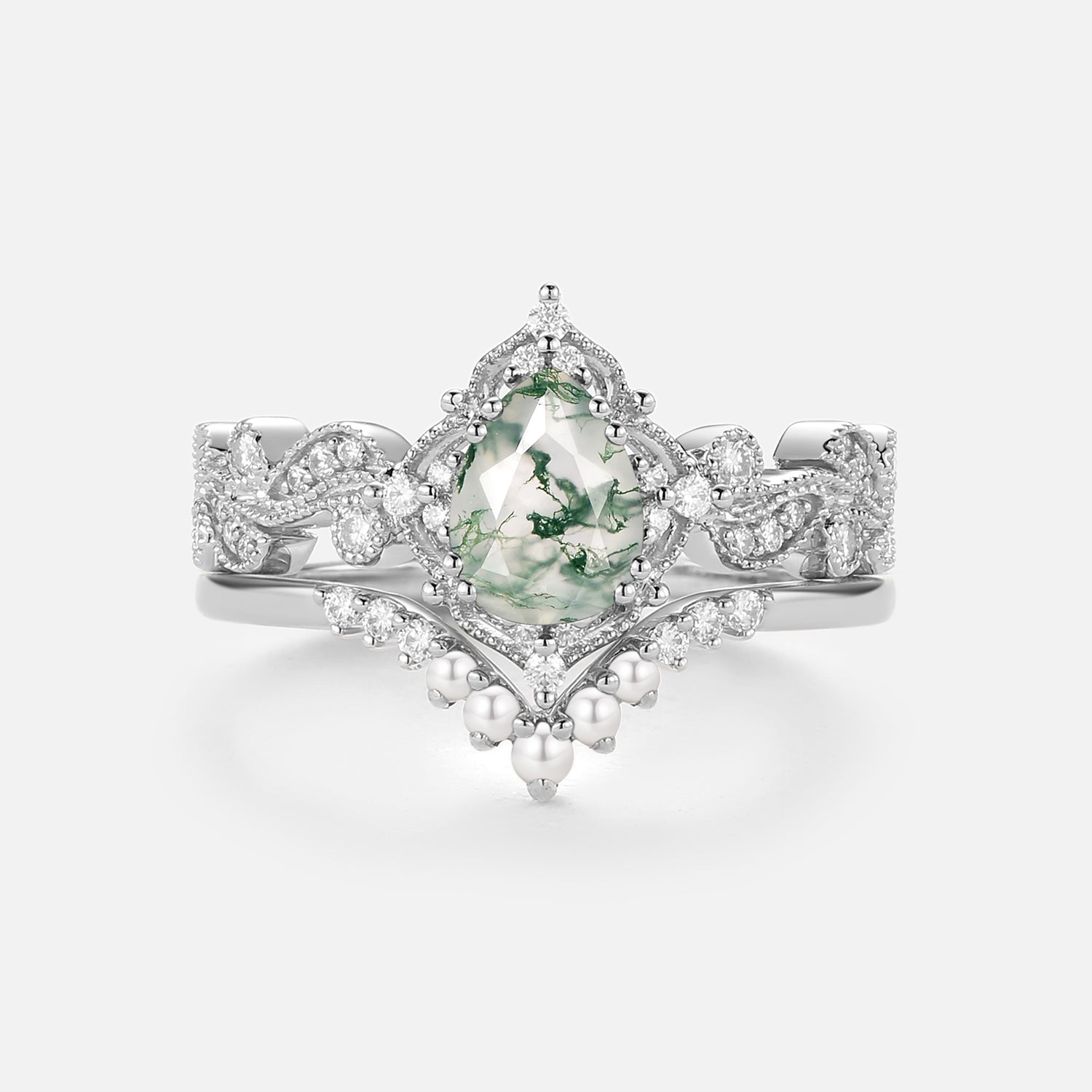 Pear Shaped Moss Agate & Pearl Engagement Ring Set 2pcs - Harper