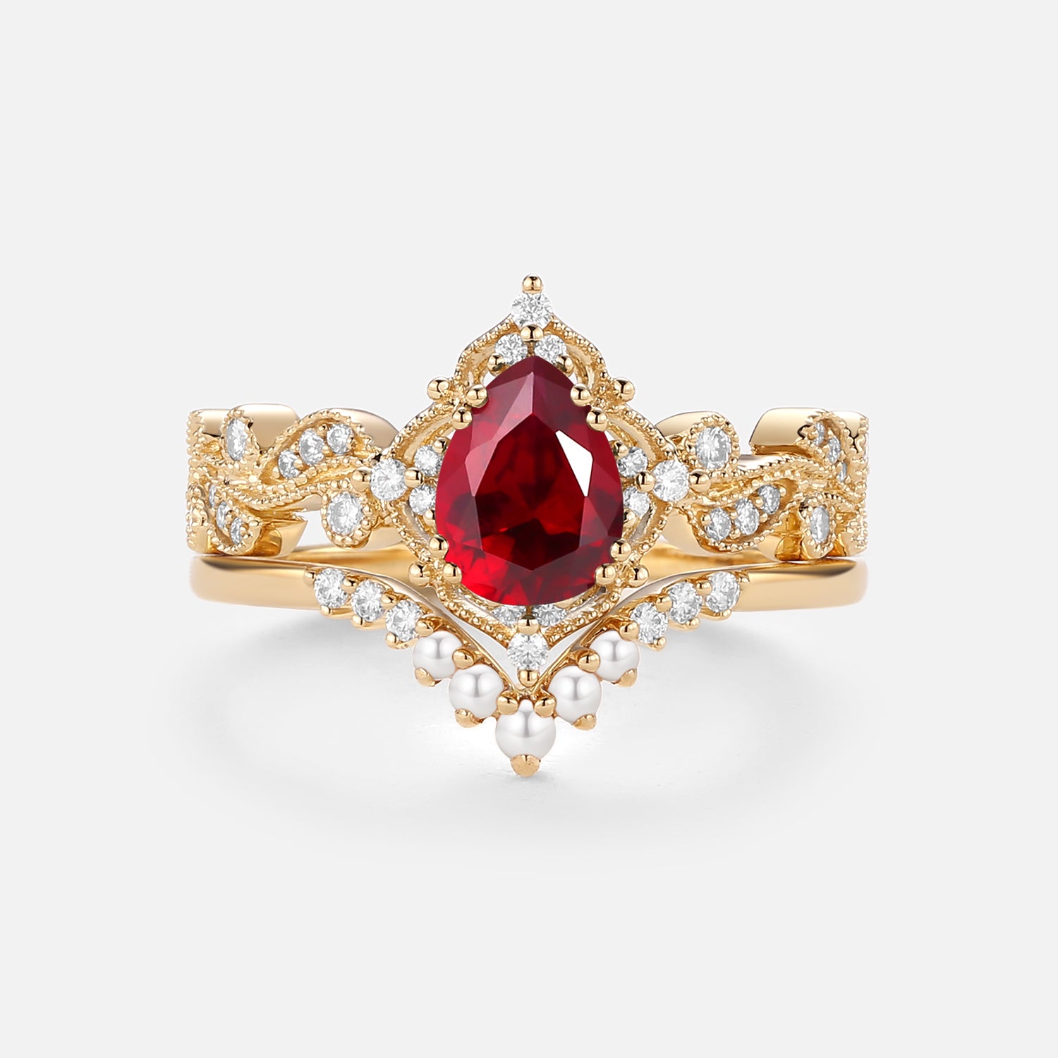 Pear Shaped Vintage Lab Ruby & Pearl Engagement Ring Set 2pcs - Harper