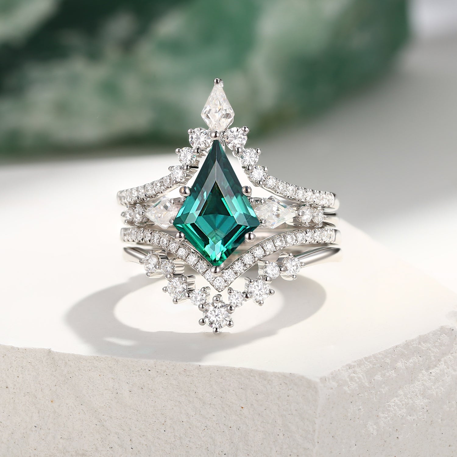 Twin Flames - Kite Cut Lab Emerald Engagement Ring Set 4pcs - Tyler