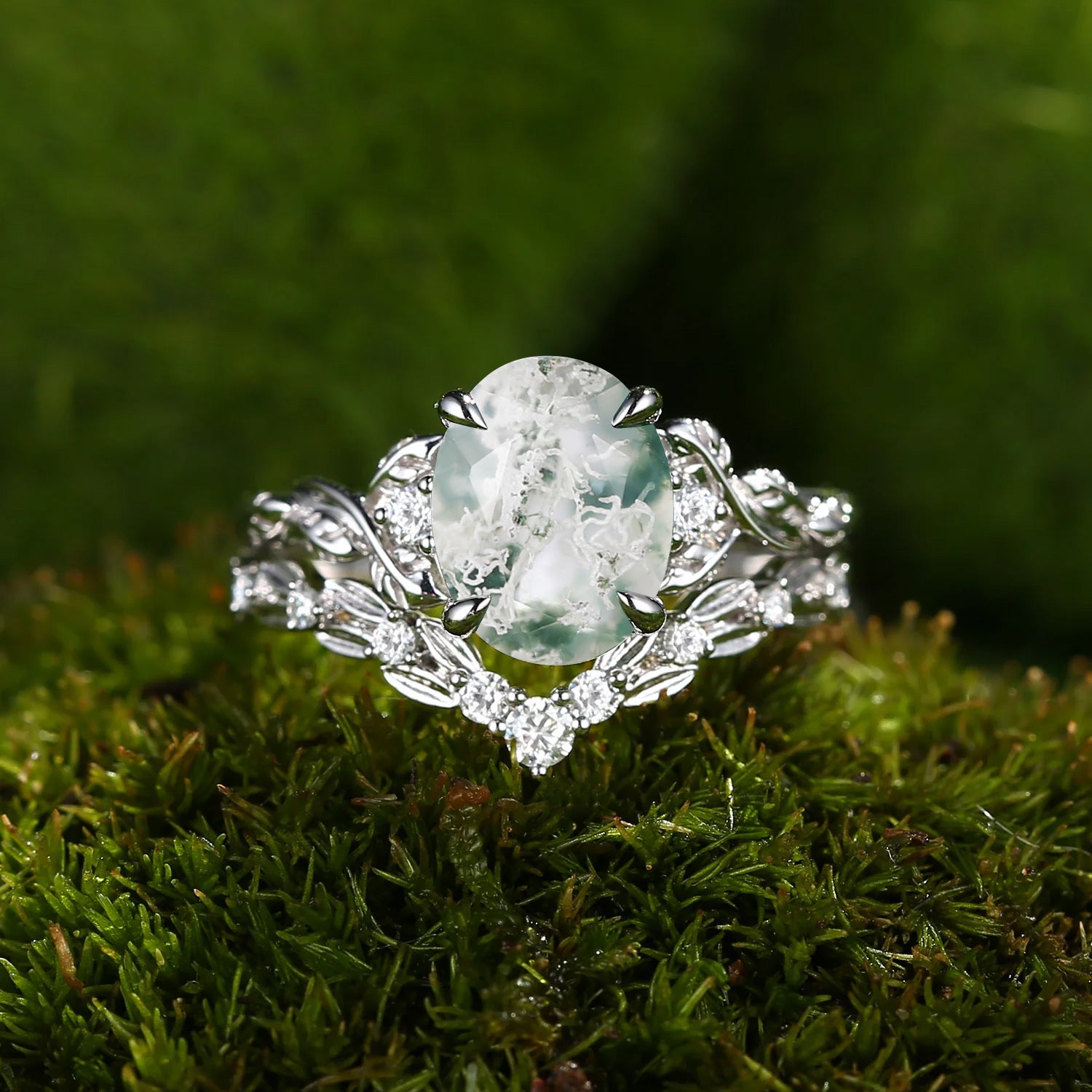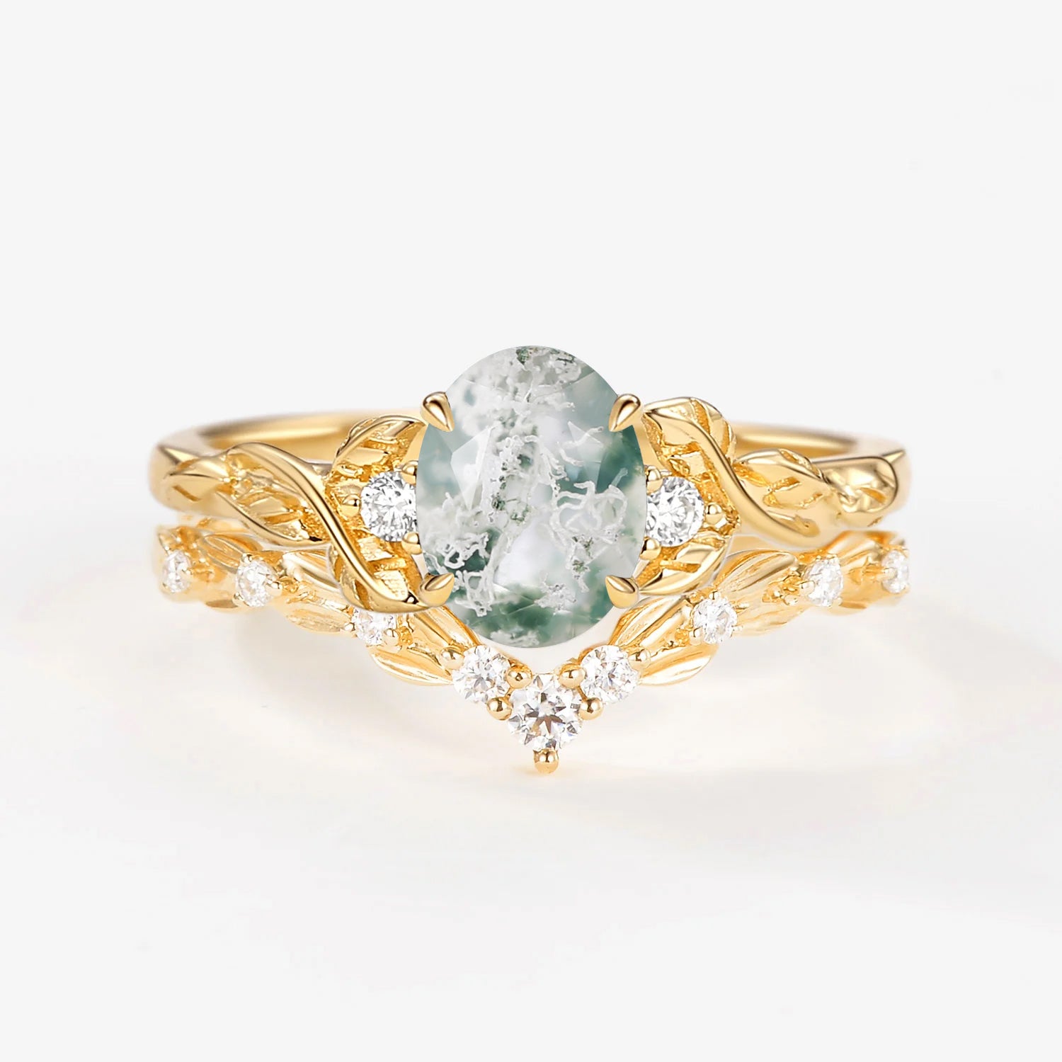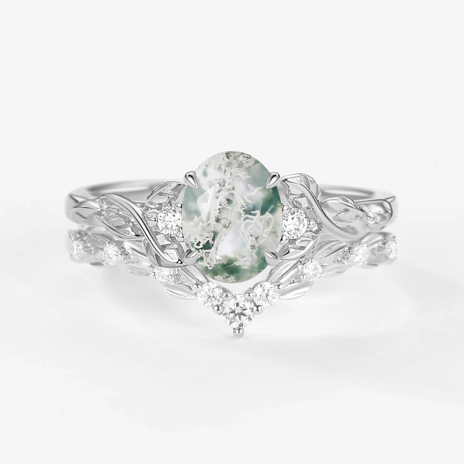 Felicegals Unique Oval Shaped Moss Agate Leafy Engagement Ring Sets 2pcs