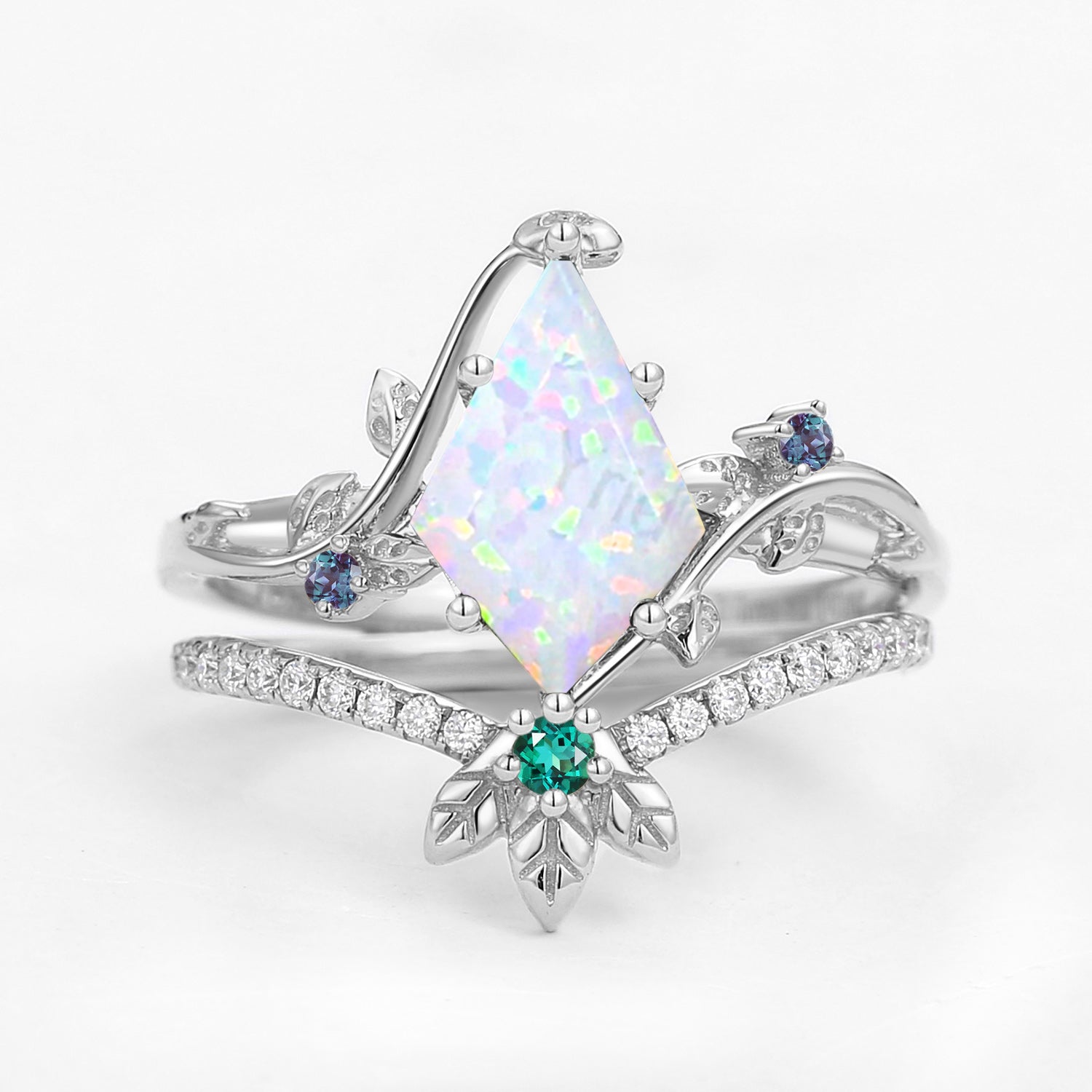 Unique Opal & Alexandrite & Emerald Three Leaves Engagement Ring Set 2pcs - Mermaid