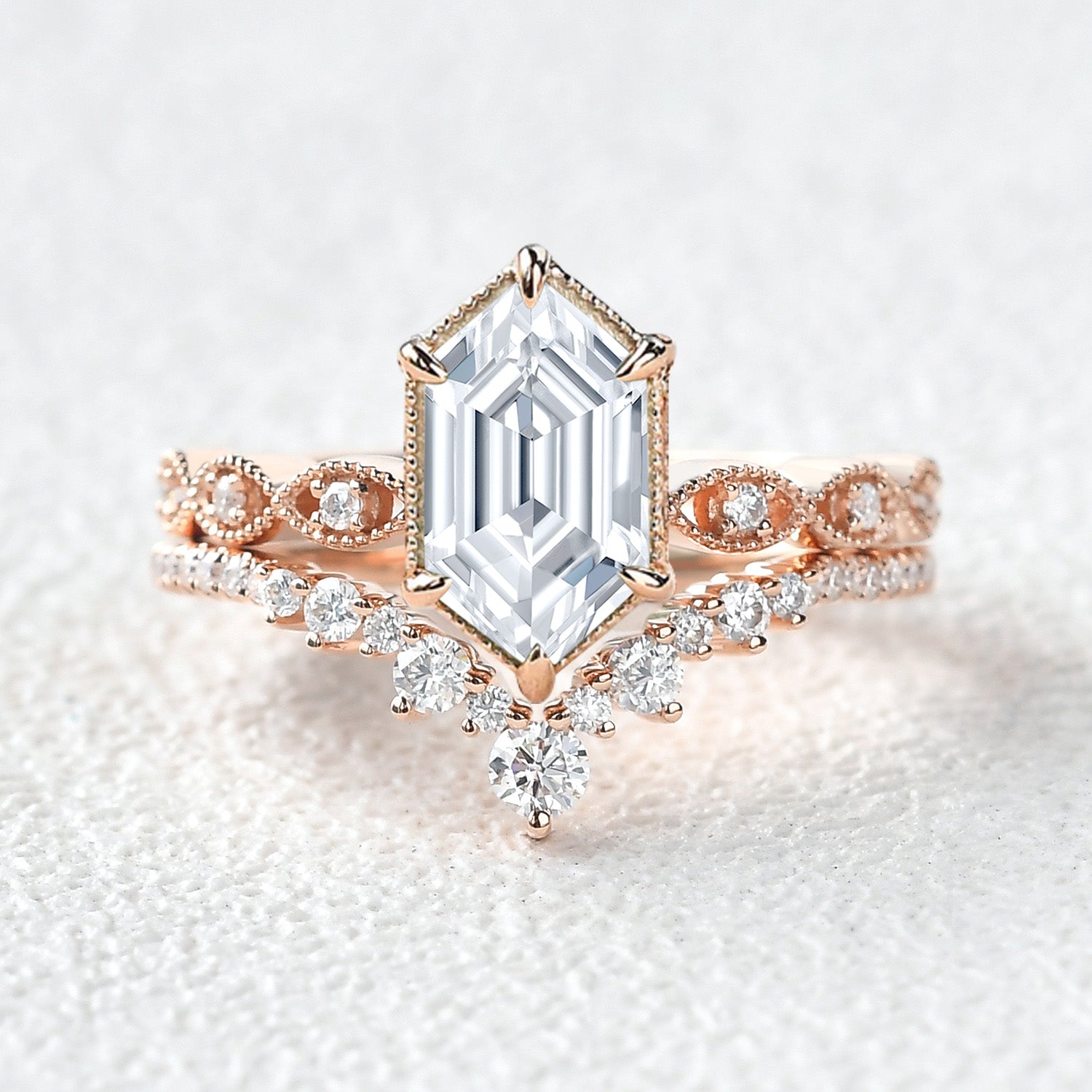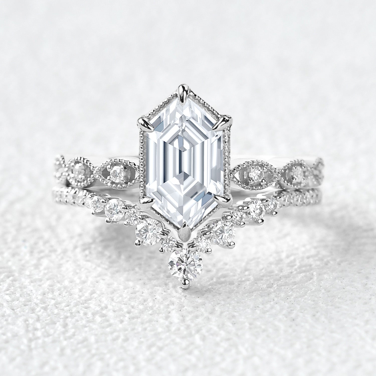 Victorian Vintage Long Hexagon Moissanite Ring Set 2pcs