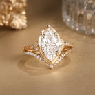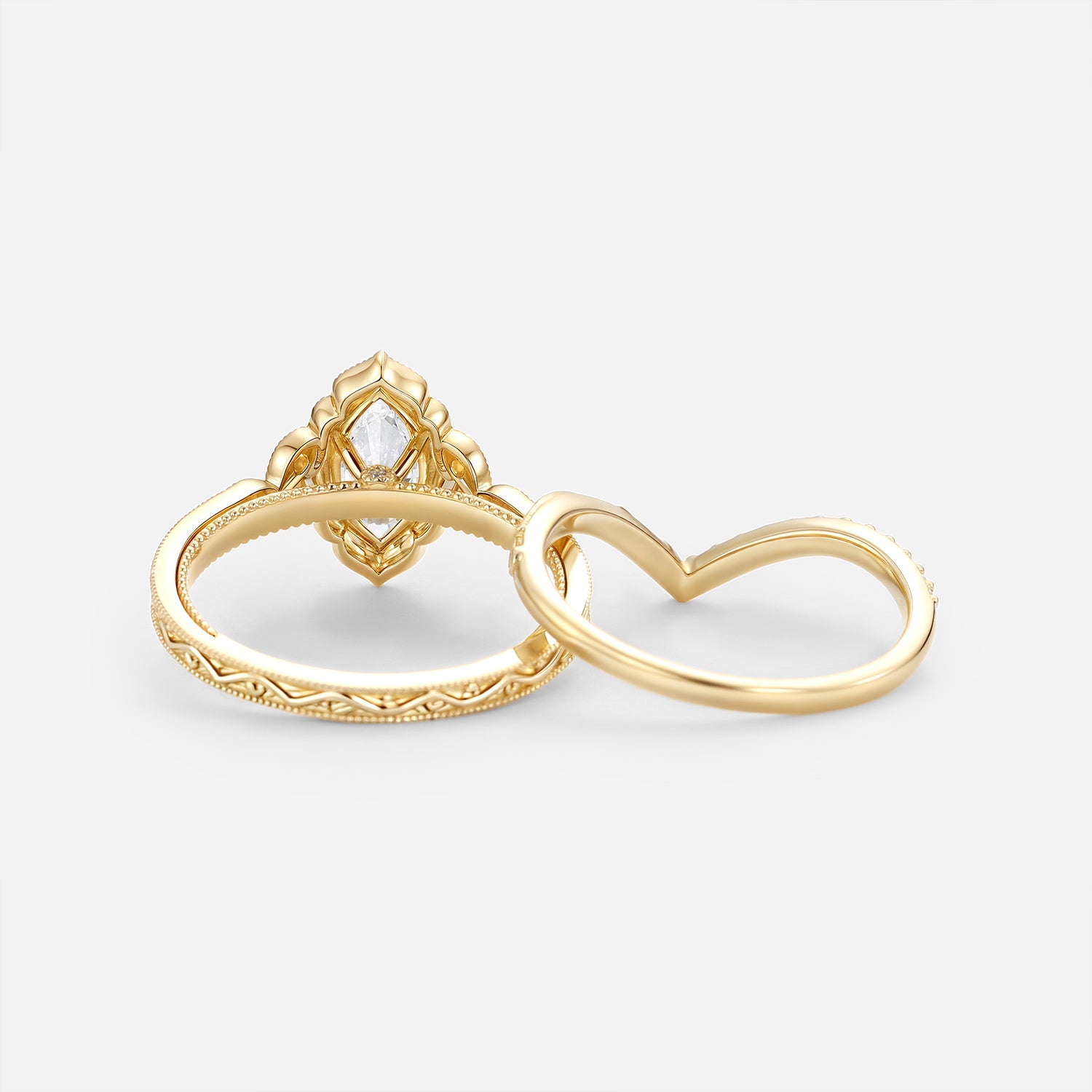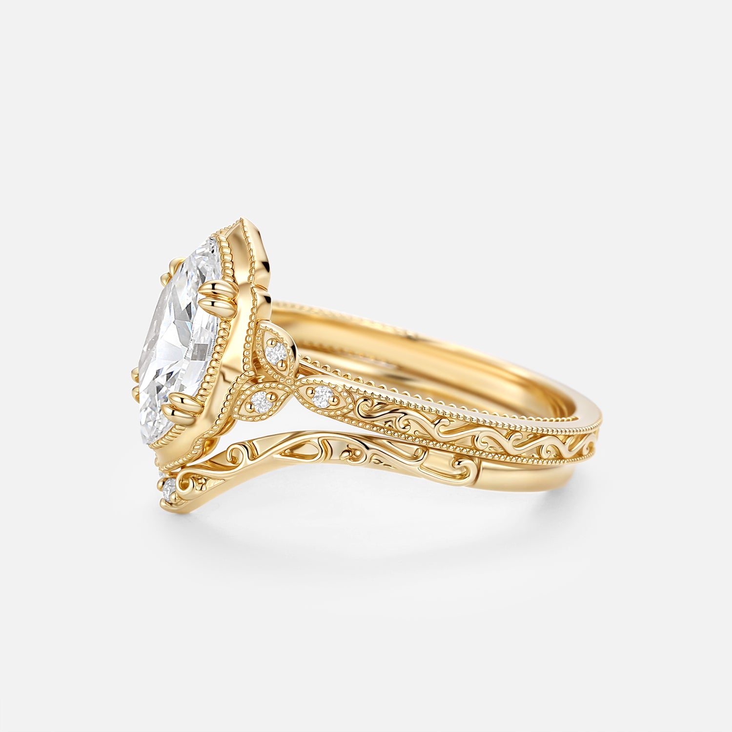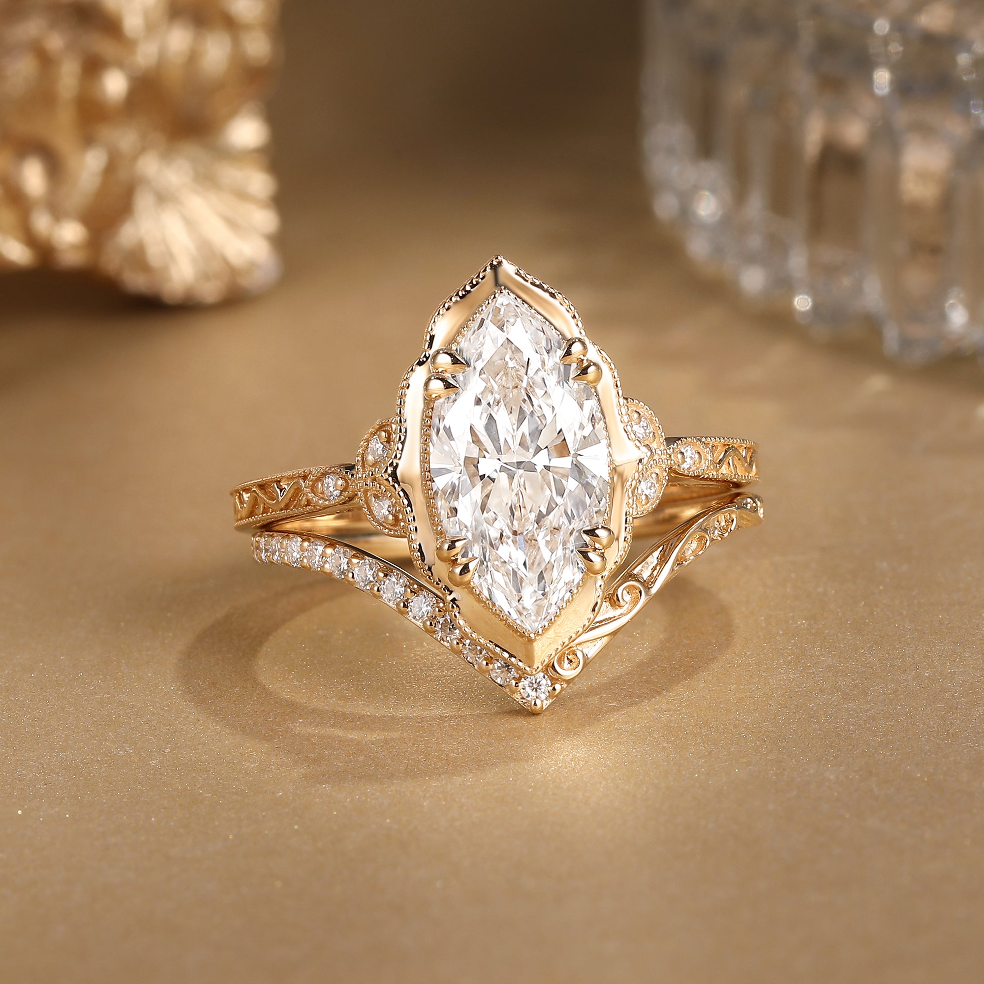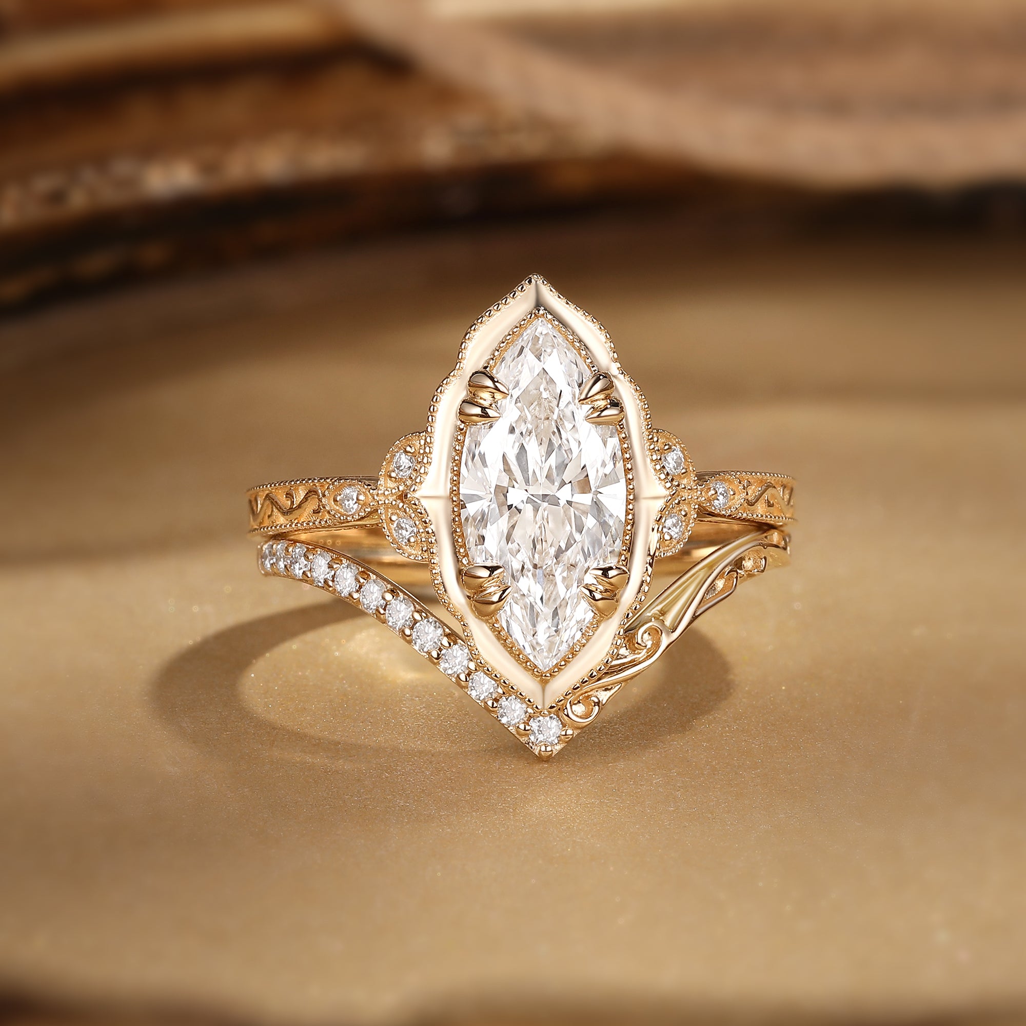 Vintage Engraved Marquise Lab Grown Diamond Engagement Ring Sets 2pcs - Eclat