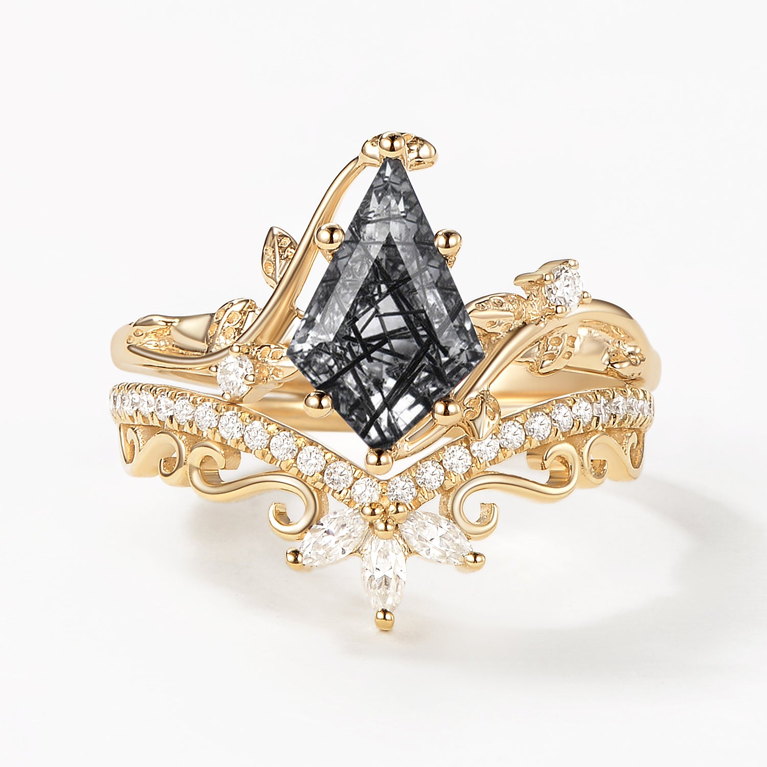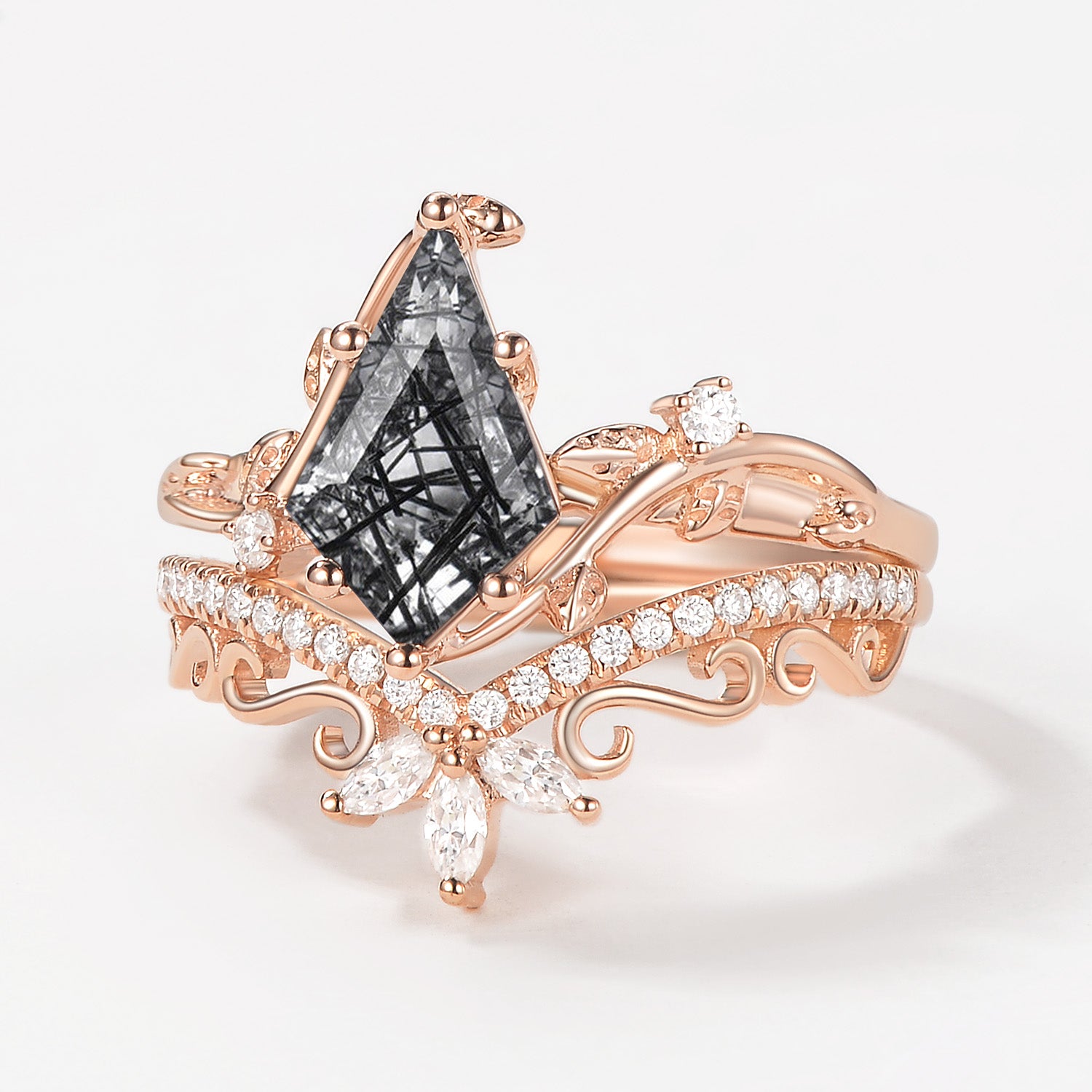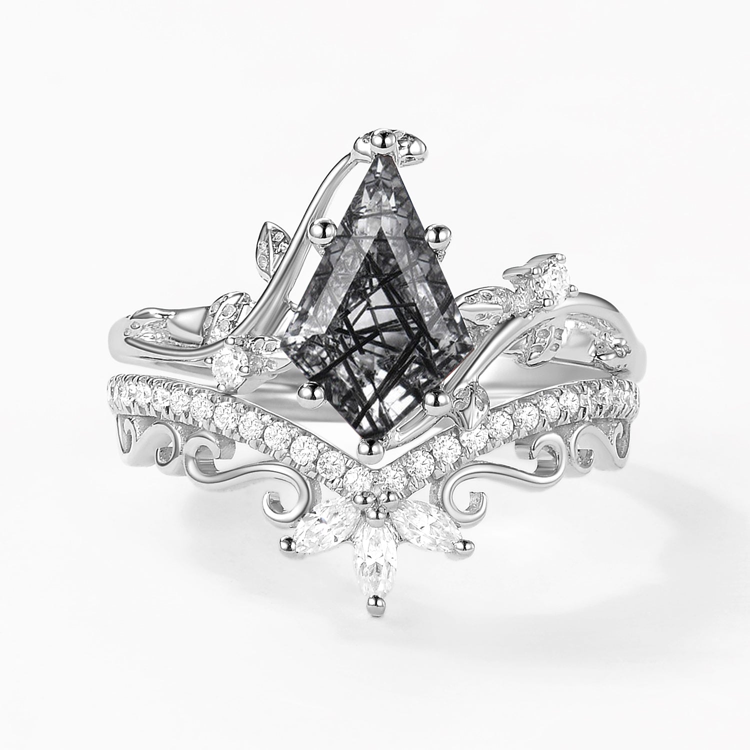 Vintage Kite Cut Black Rutilated Quartz Engagement Ring Set 2pcs - Daniella