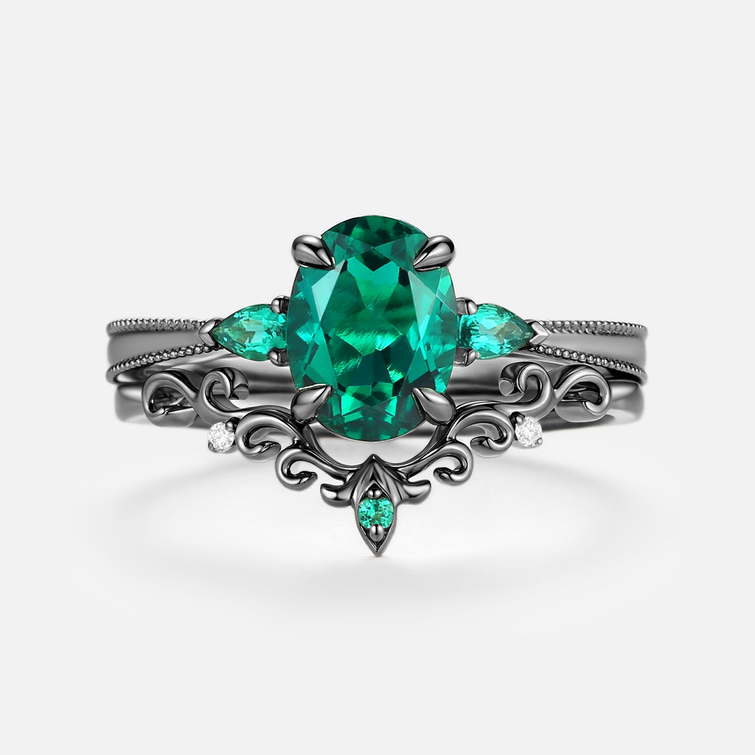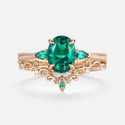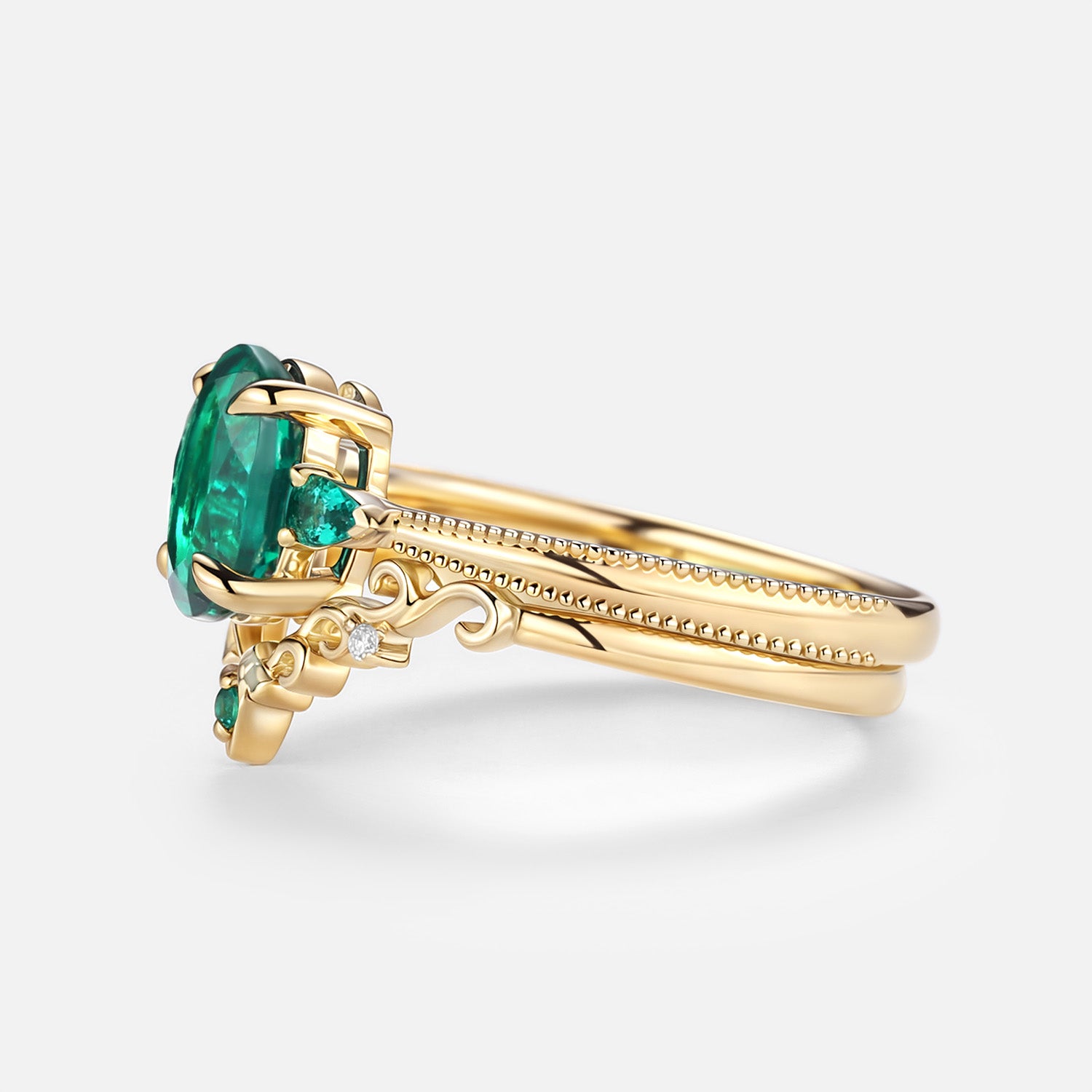 Vintage Oval Cut Lab Emerald Engagement Ring Sets 2pcs - Foliate
