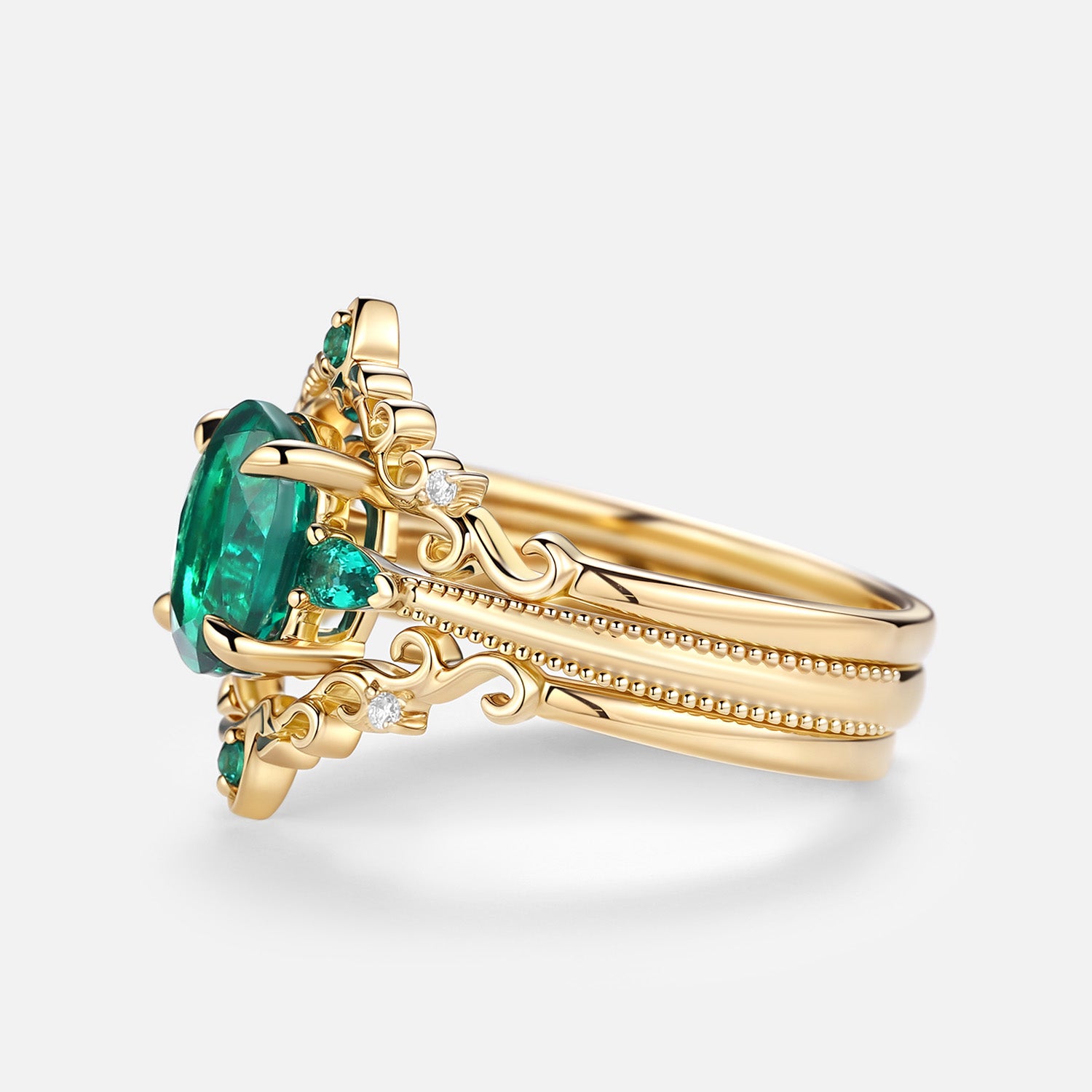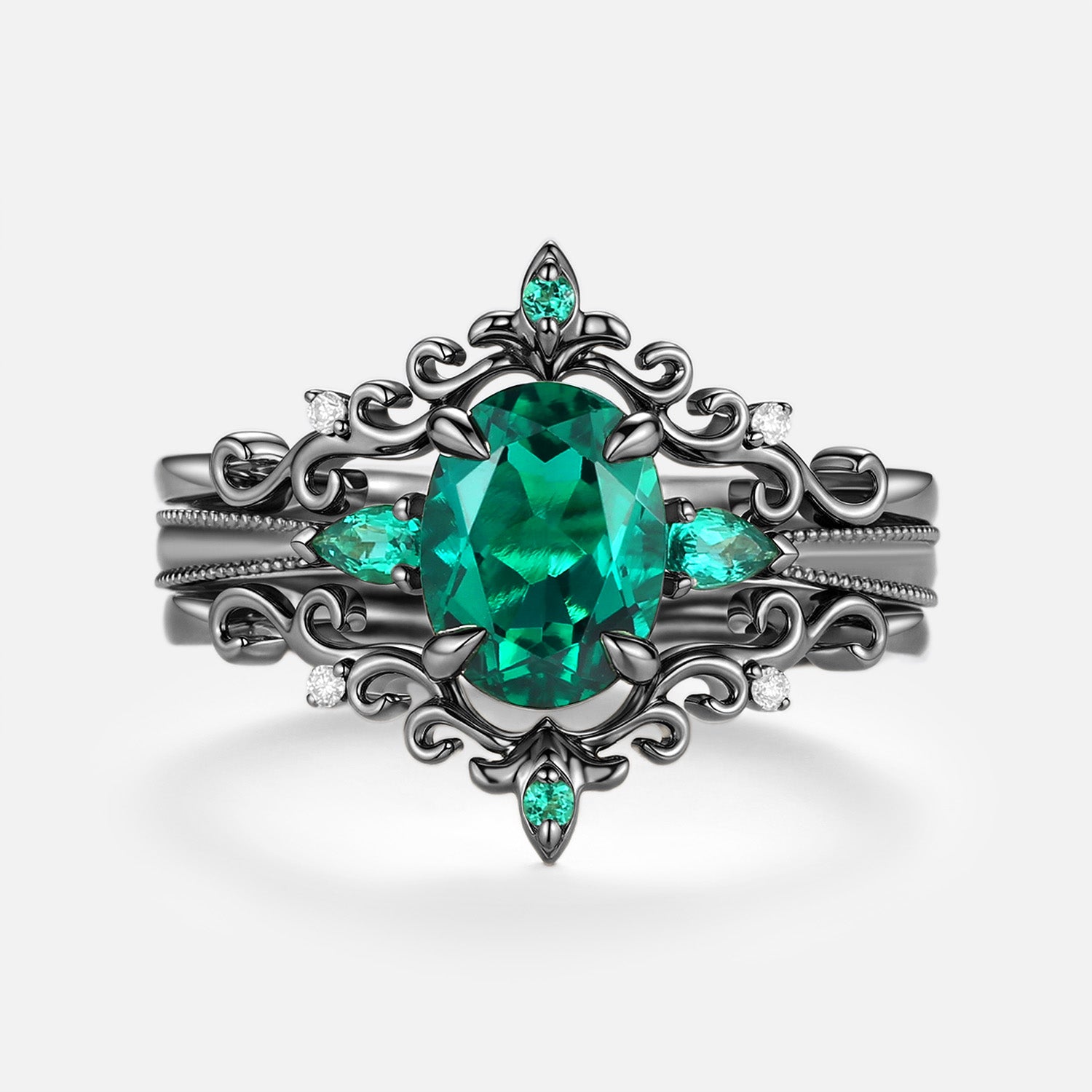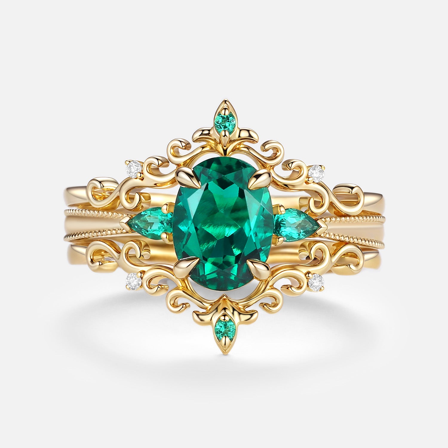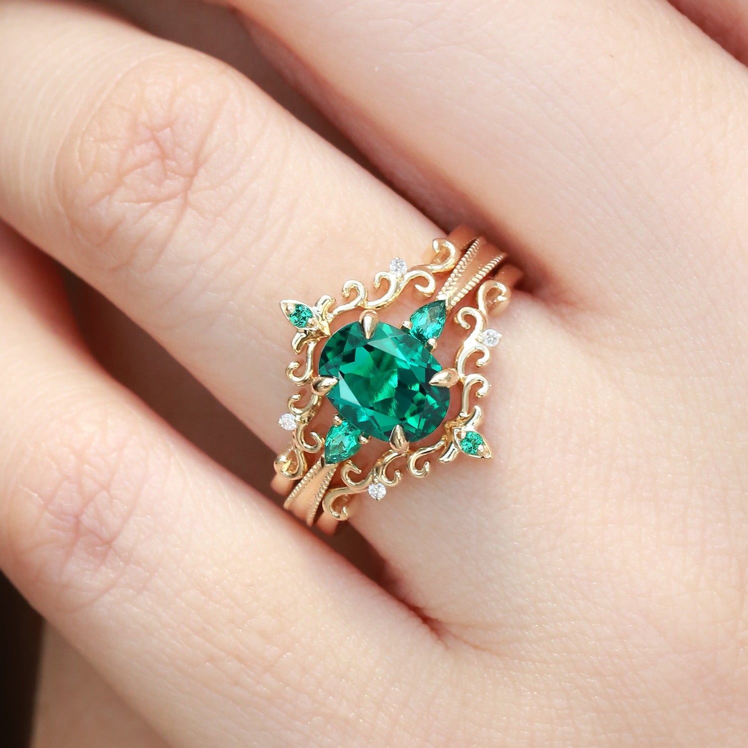 Vintage Oval Cut Lab Emerald Engagement Ring Sets 3pcs - Foliate